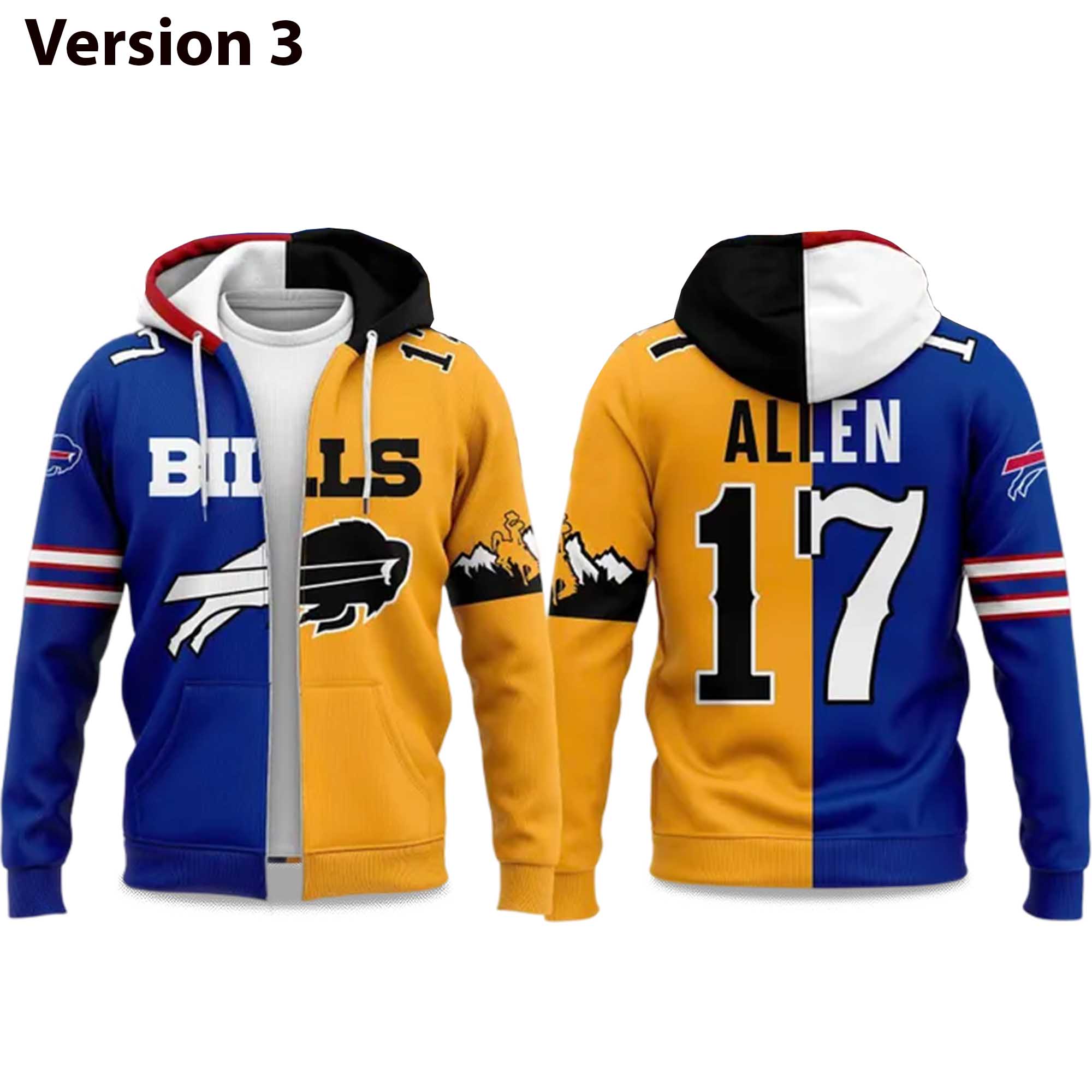 The design uses a vertical split pattern that highlights both the Cowboys and Bills identities. Mountain prints, sleeve stripes, and a strong athletic fit add visual depth. A front zipper makes it easy to layer, while an adjustable hood and ribbed cuffs keep the shirt snug. Fans appreciate the vibrant colors, balanced print, and how the design honors two important stages of Allen’s football career.