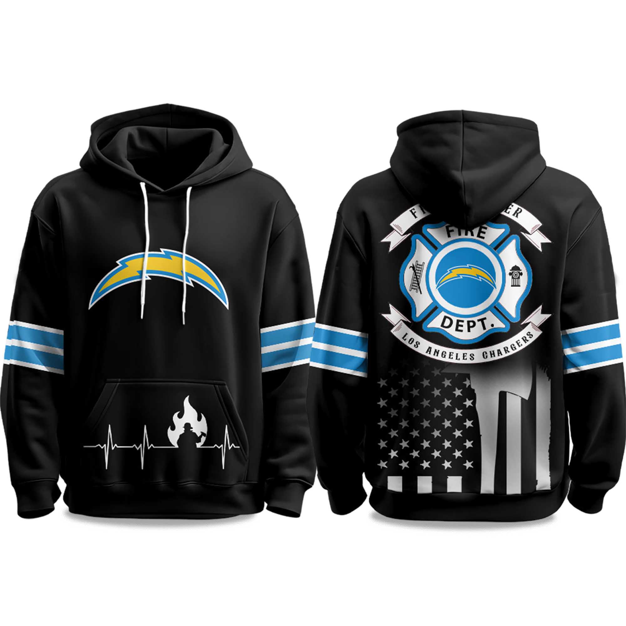 The front presents the iconic Chargers bolt flashing in golden yellow and sky blue, cutting across a deep black backdrop. Below it, the heartbeat line and flame graphic reflect resilience, strength, and life’s pulse. On the back, a firefighter’s crest fuses seamlessly with the Chargers emblem, framed by the black-and-white U.S. flag — a nod to unity and sacrifice. Blue sleeve stripes bring energy and motion, while the soft fleece keeps you warm through long nights and cool mornings. It’s tough enough for the field, yet comfortable enough for everyday wear.