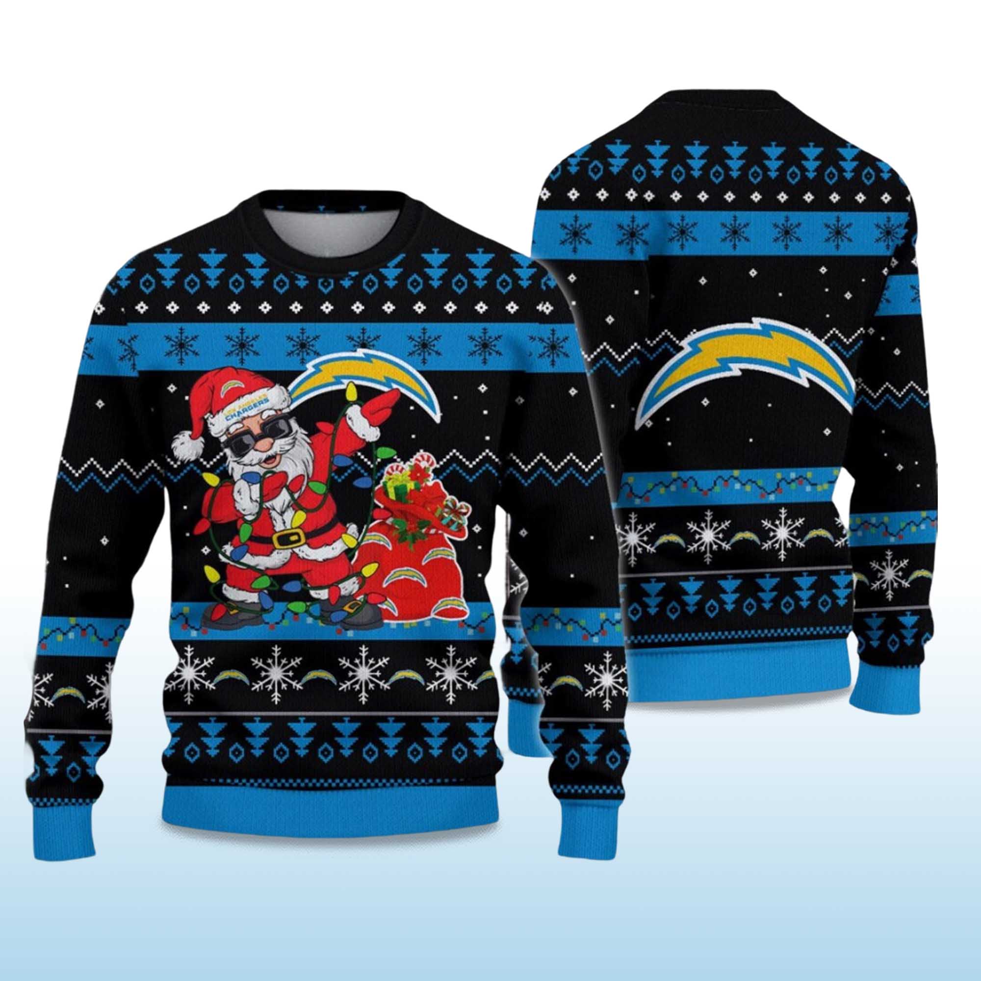Designed with precision, this sweater features a bold mix of the Chargers’ signature blue, white, and black tones. The front highlights Santa delivering gifts from his red sack, each tagged with the Chargers logo. The back proudly displays the lightning bolt emblem — a nod to the team’s fierce energy. Made with soft, breathable fabric, ribbed cuffs, and a snug fit, it ensures comfort and warmth through every holiday event.