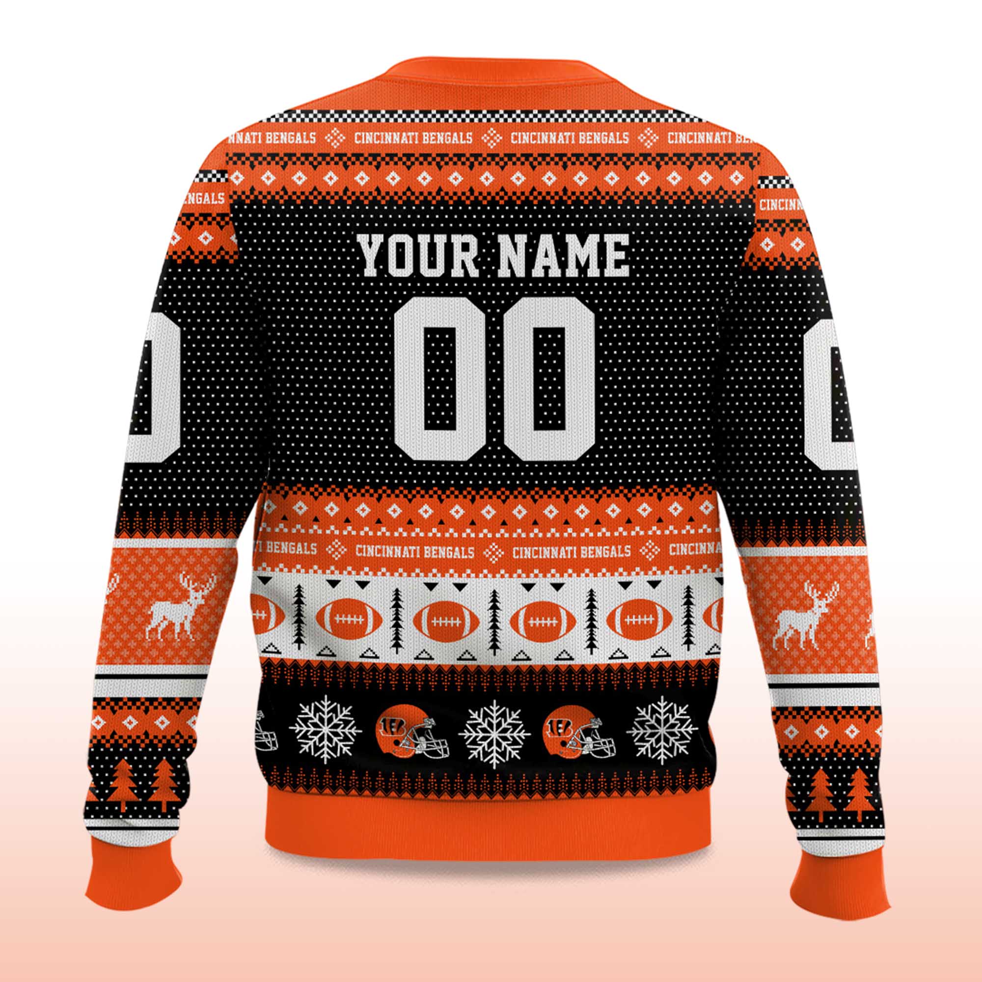 Get ready for the holidays with the 2025 Christmas Bengals Personalized Ugly Sweater. Dressed in Cincinnati Bengals’ signature orange and black color scheme, this sweater features a large “B” logo on the chest, a variety of football icons, snowflakes, reindeer, and a tree silhouette. You can optionally add your favorite name or number to the back, making this sweater your own. A relaxed fit perfect for game-day viewing parties, family gatherings, or cozy nights in the woods. Bold colors and vibrant prints help you stand out and show off your Bengals pride.