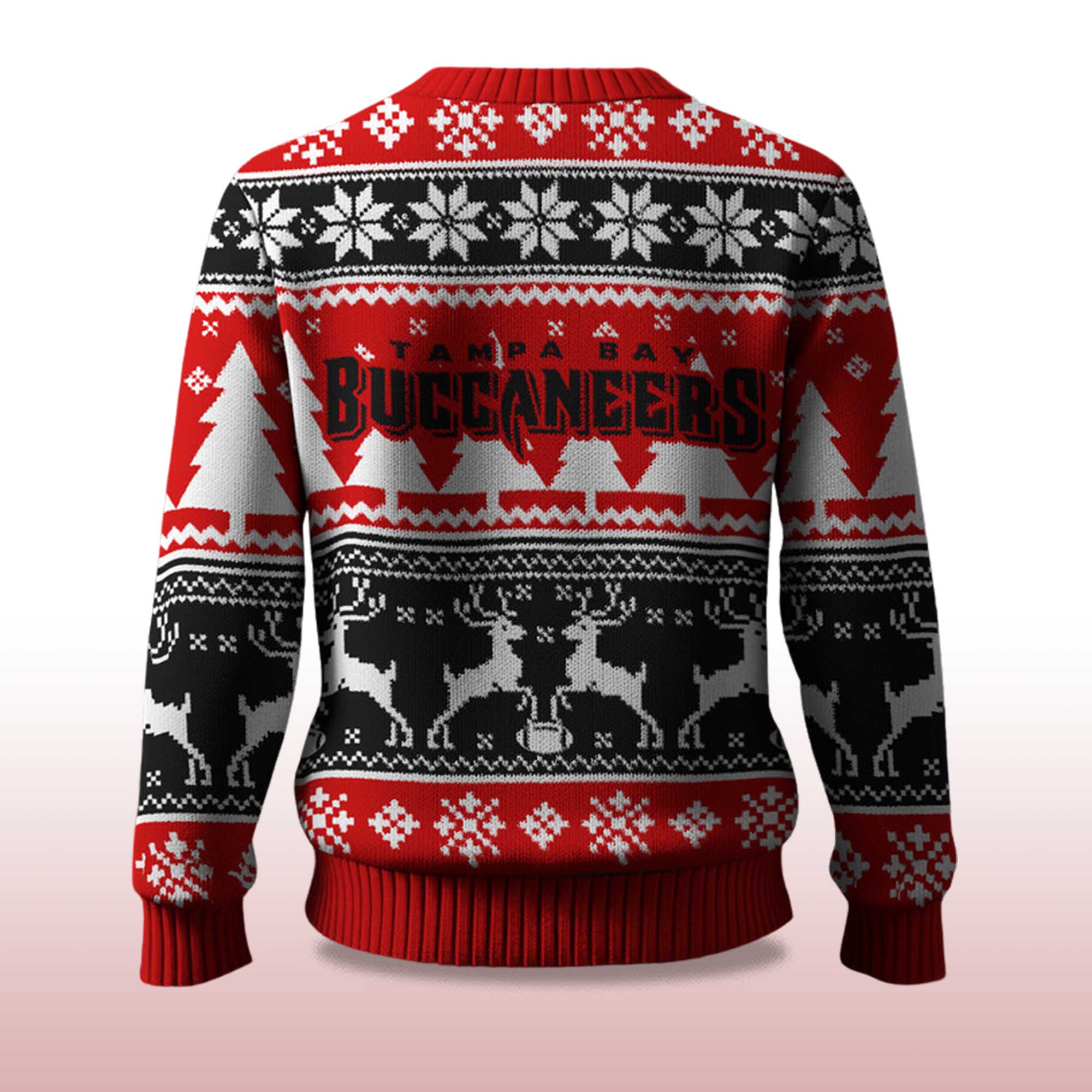 This eye-catching sweater features a prominent Buccaneers skull and flag logo printed on the chest, surrounded by reindeer, snowflake, and Christmas tree motifs. The red body stands out against the black and white background, creating a dynamic look that reflects the team’s spirit while bringing warmth to the holiday season. The knit construction ensures durability and comfort, while the ribbed cuffs and soft neckline keep you warm on cold winter nights.