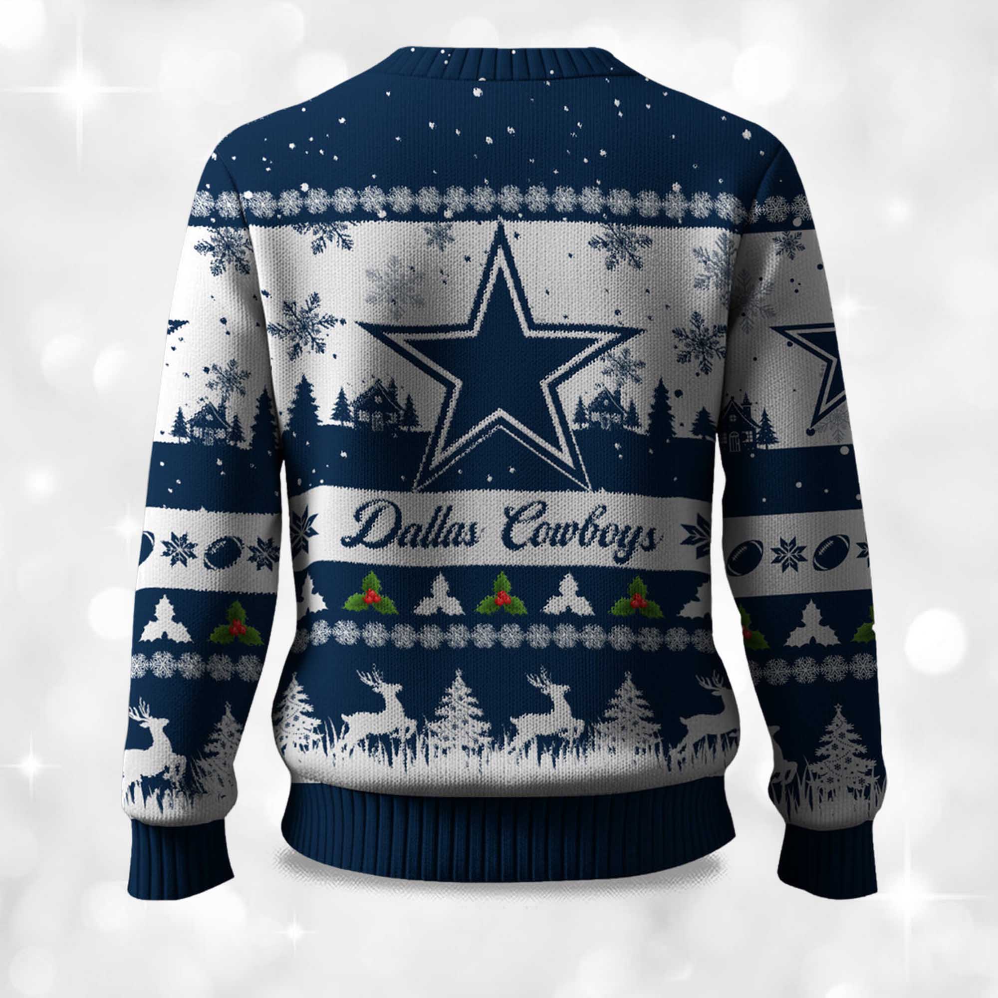 The 2025 Christmas Cowboys Festive Reindeer Tree Ugly Sweater combines a strong navy color scheme, crisp winter prints, and the familiar star logo that proud Cowboys fans love. Snowflakes, reindeer, and pine trees dance across the knit fabric, giving the sweater a playful look that’s perfect for holiday parties and lively evenings.