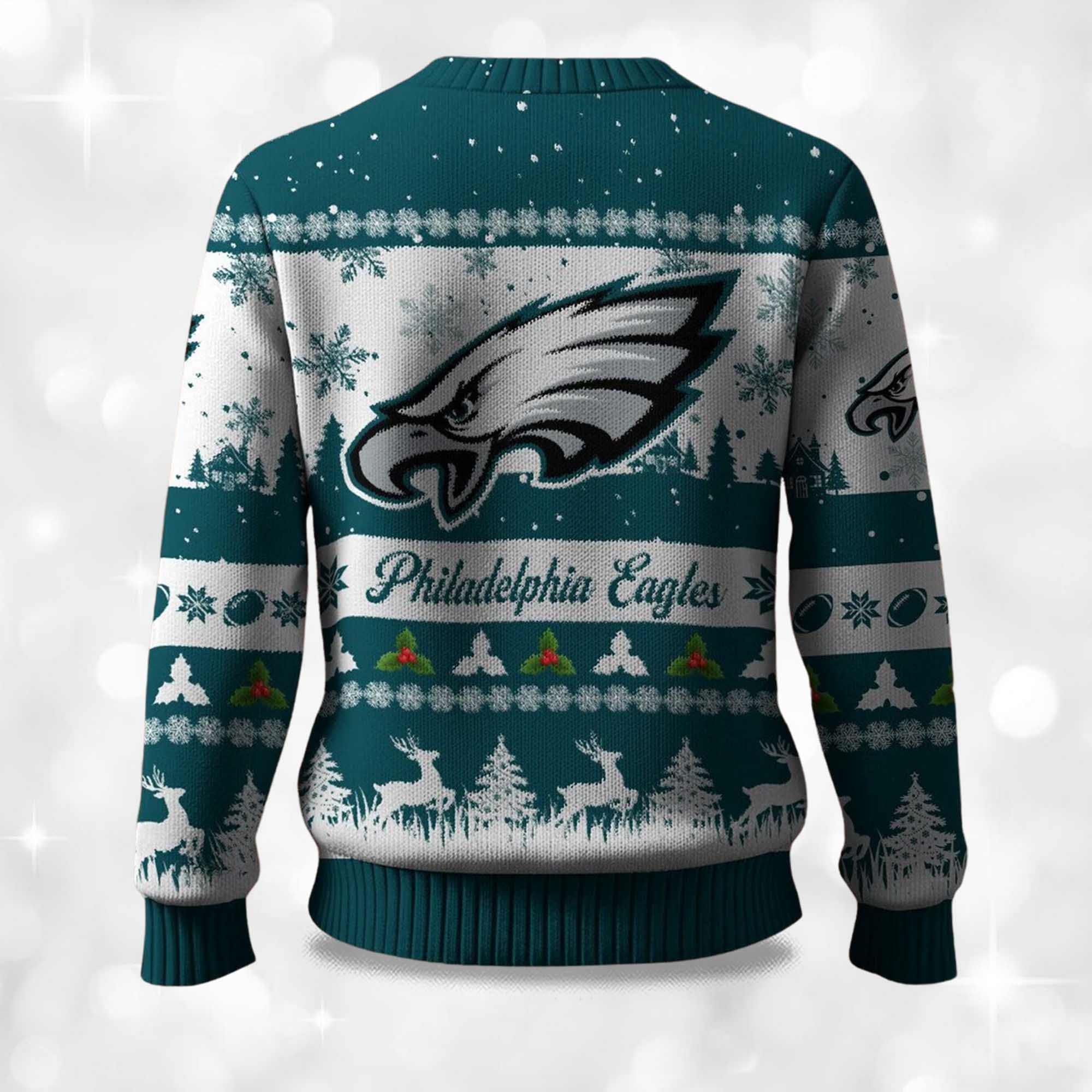 The 2025 Christmas Eagles Festive Reindeer Tree Ugly Sweater features a vibrant mix of green, silver, and winter motifs inspired by the Philadelphia team’s iconic identity. Snow, reindeer silhouettes, and tree motifs surround a large, soaring eagle logo, creating a vibrant, festive look that instantly energizes any celebration.