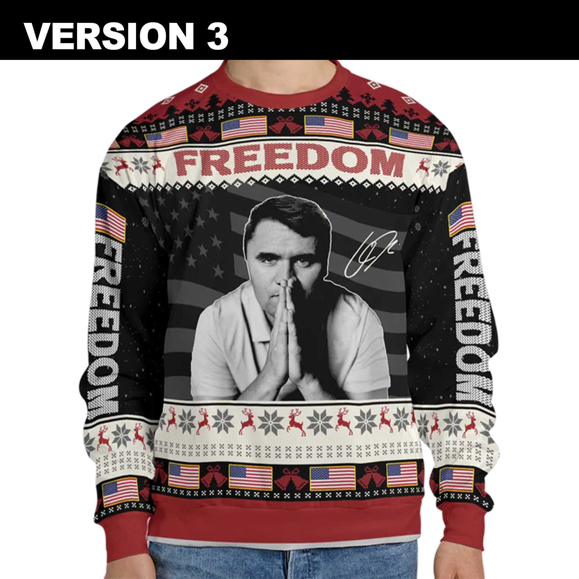 This sweater features a confident Charlie Kirk silhouette against a backdrop of stars and stripes and the bold word “FREEDOM”. Snowflakes, flags and reindeer surround the sweater for a festive look that blends humor and national pride. Available in red, navy and black, each design features unique details that make a statement. The soft, breathable fabric provides all-day comfort while keeping you warm and cozy during every Christmas moment.