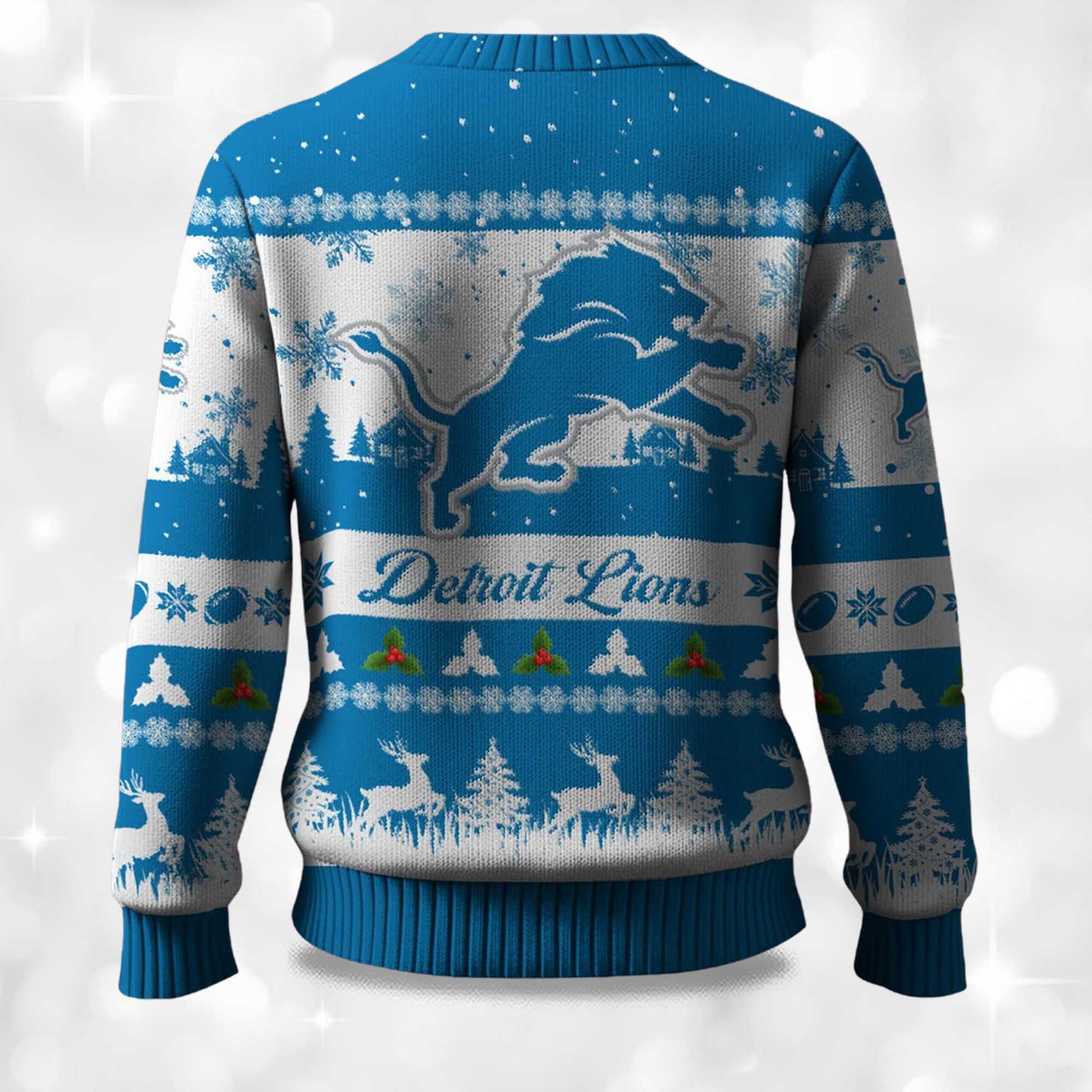 The 2025 Christmas Lions Festive Reindeer & Tree Ugly Sweater brings the joyful holiday spirit and Detroit pride to life. The bright blue and white color scheme, playful winter iconography, and bold Lions logo make it a fun choice for parties, game nights, and family gatherings. Fans can show their support for the team while enjoying a fresh, warm, and inviting look for the season.