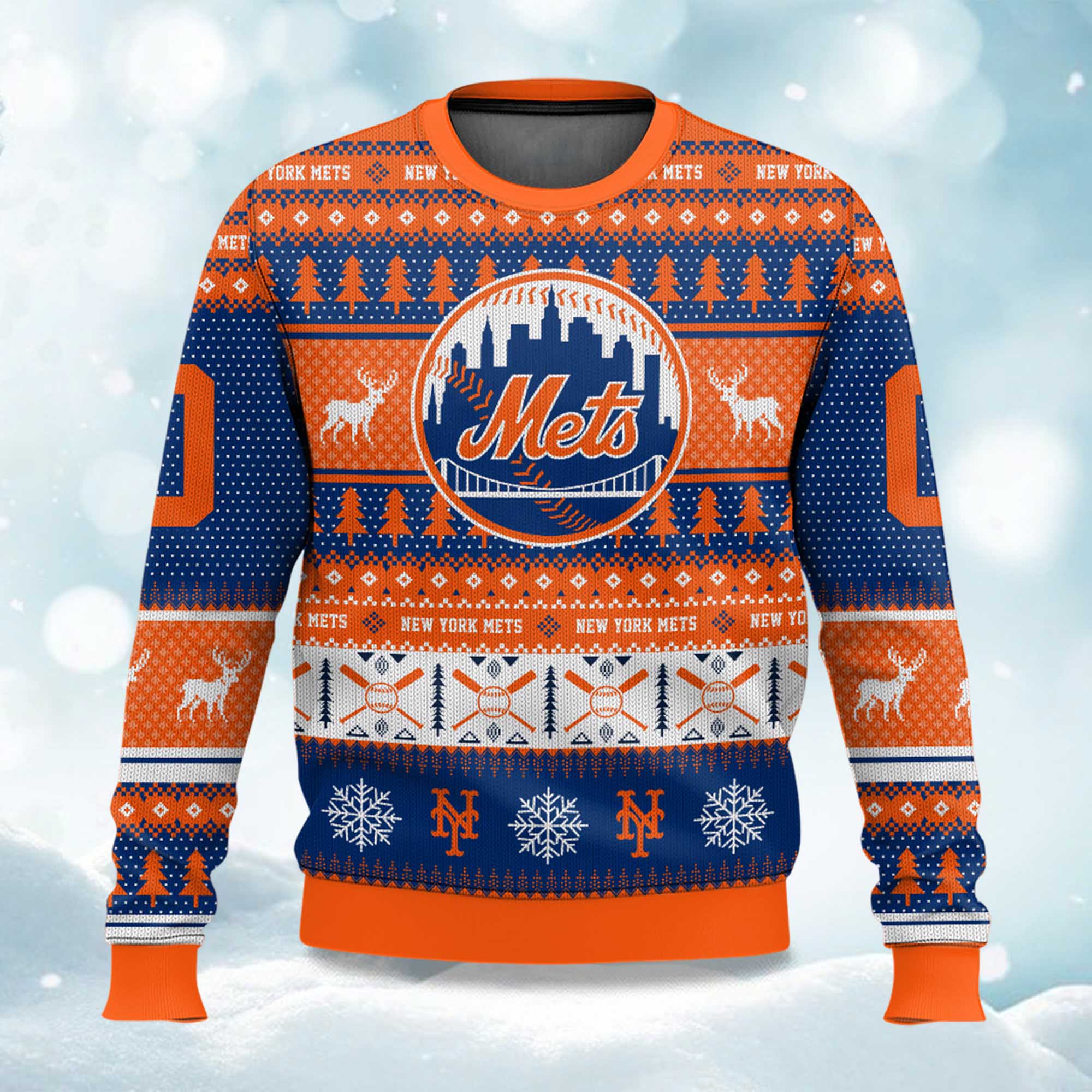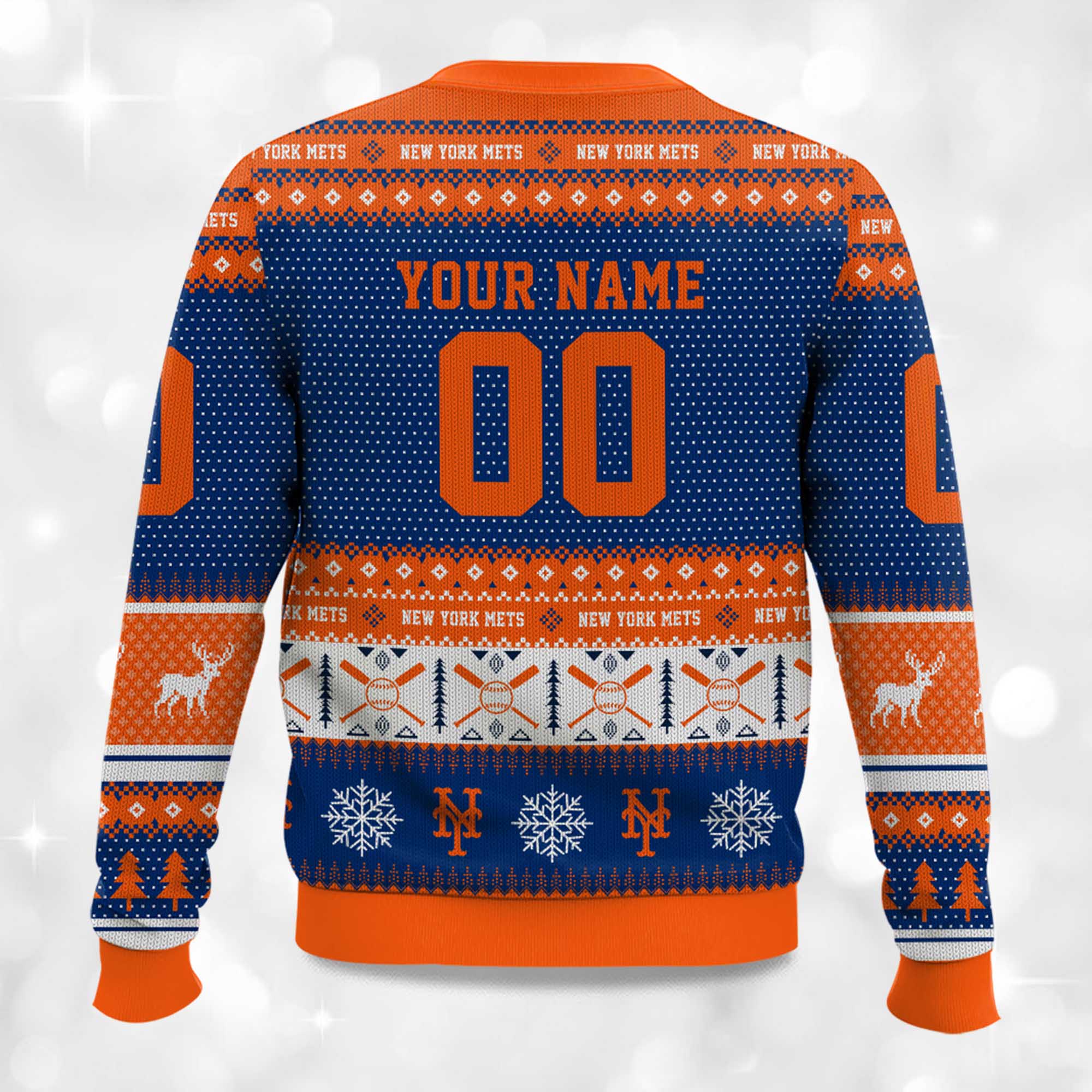 From the bold Mets logo at the center front, to the iconic winter print combined with baseball style, this sweater stands out from the crowd. The orange and blue color combination creates a unique team identity. The back allows for customization so you can wear your name and number. The sleeves feature additional details and a cuffed hem for added warmth. The sweatshirt comes in both adult and kid sizes, allowing the whole family to wear it. Whether layered under a winter coat or worn alone at home, this sweatshirt brings warmth, team pride, and holiday cheer.