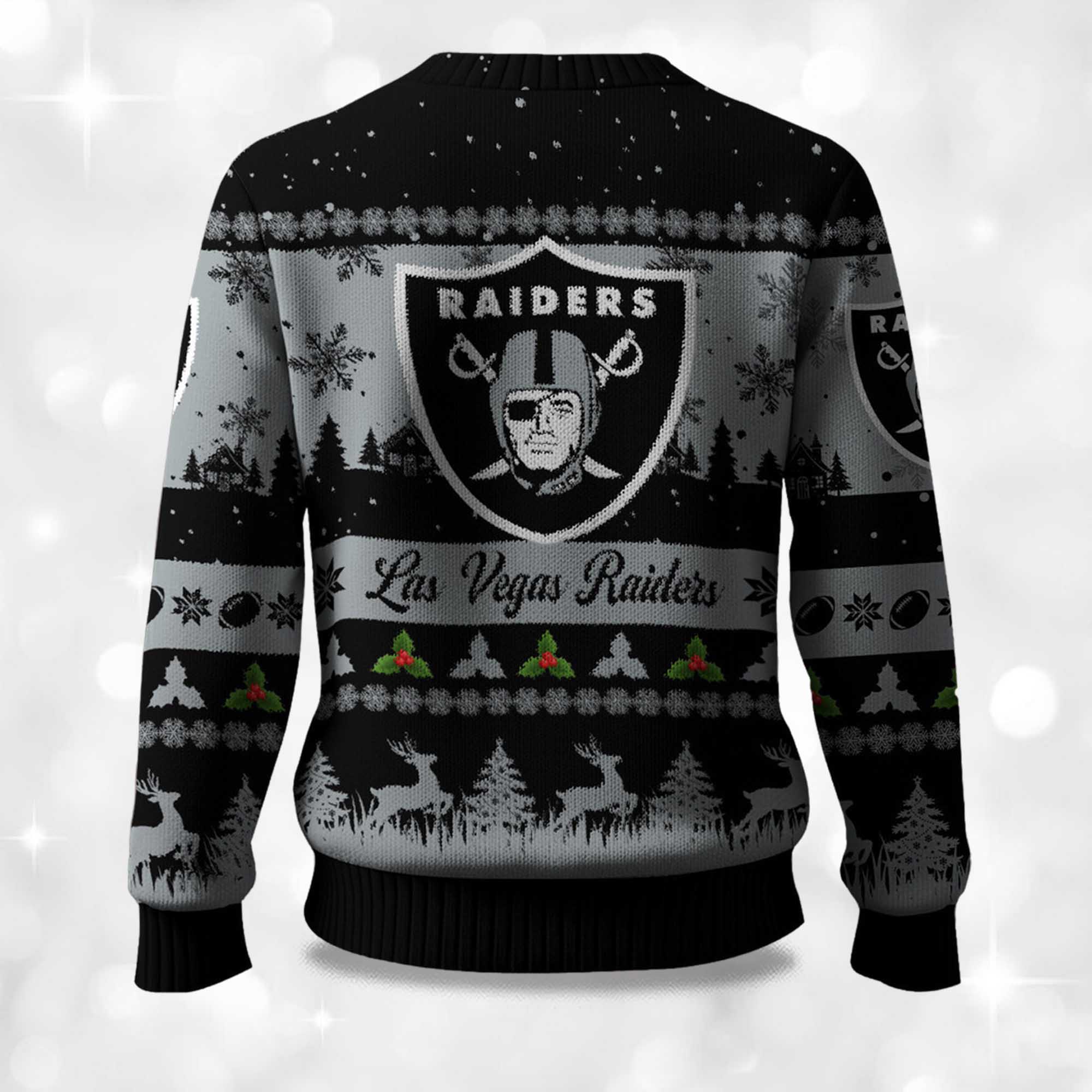 The 2025 Christmas Raiders Festive Reindeer & Tree Ugly Sweater brings a festive feel to anyone looking to combine football energy with seasonal style. The classic silver and black color palette is paired with snow trees, reindeer, and small, festive accents for a warm and vibrant look that’s perfect for gatherings, photo shoots, or relaxing evenings at home.