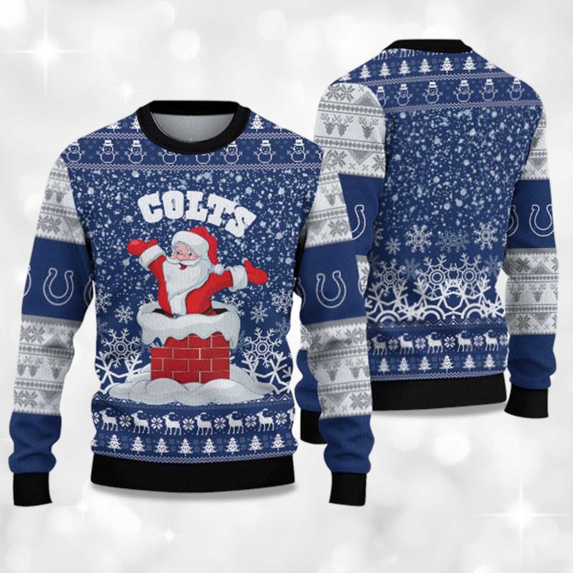 Get into the holiday spirit by representing your team with the 2025 Colts Funny Santa Christmas Ugly Sweater. This eye-catching sweater combines the Colts’ signature blue-and-white color scheme with classic seasonal motifs snowflakes, reindeer, jolly Santa and a striking image of Santa Claus climbing down the chimney. This comfy sweater is perfect for game-day parties, office sweater contests, or cozy nights watching the playoffs. Whether you’re partying before the game or snuggling up by the fire, this sweater will bring team pride and holiday cheer to the entire team.