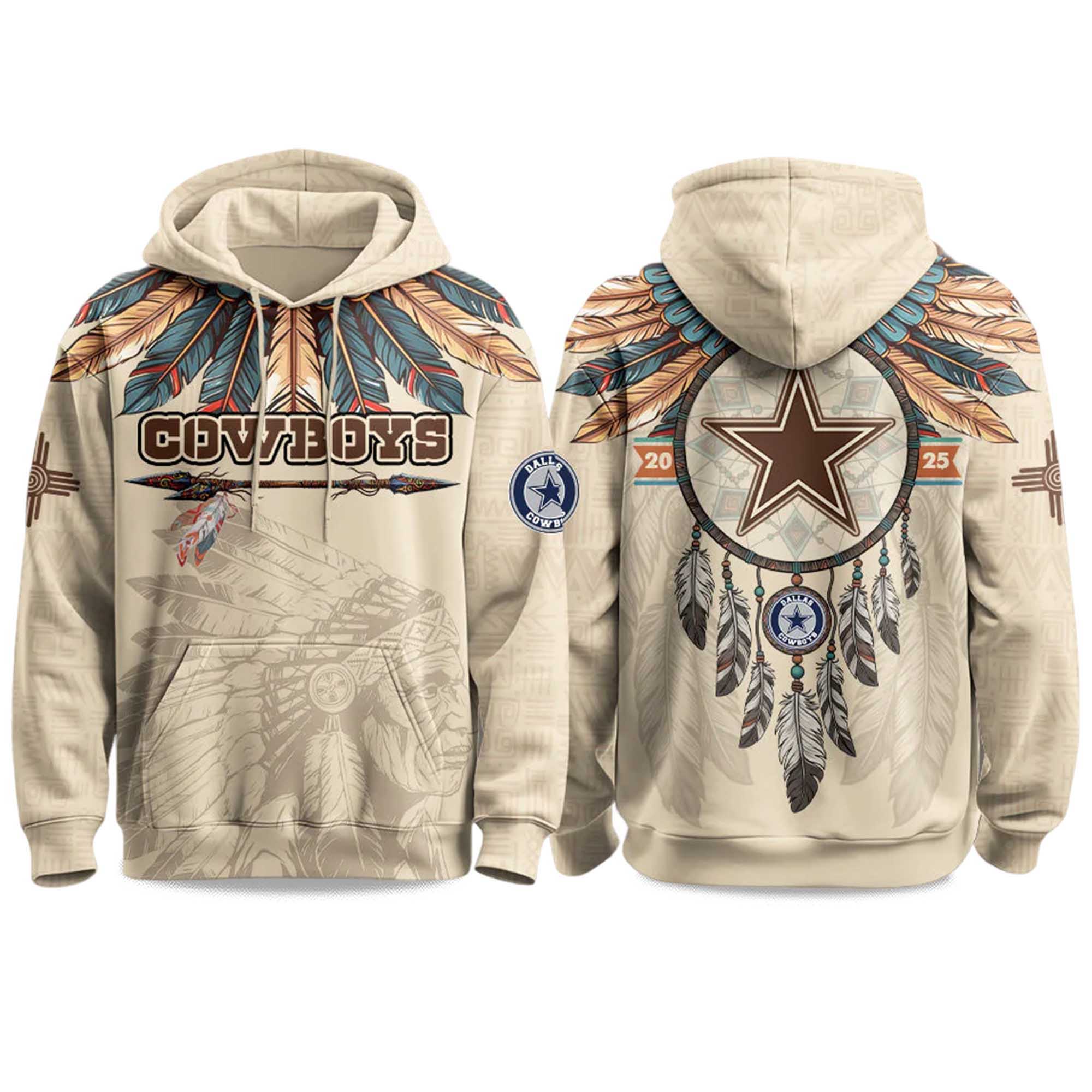 The 2025 Cowboys Native American Heritage Month Hoodie features a striking visual structure where feather clusters, earth-tone motifs, and the Cowboys star blend into a unified statement. The front features bold tribal lines combined with the word “COWBOYS,” while the back star is nestled in an ornate crest, creating a design filled with movement and emotion.