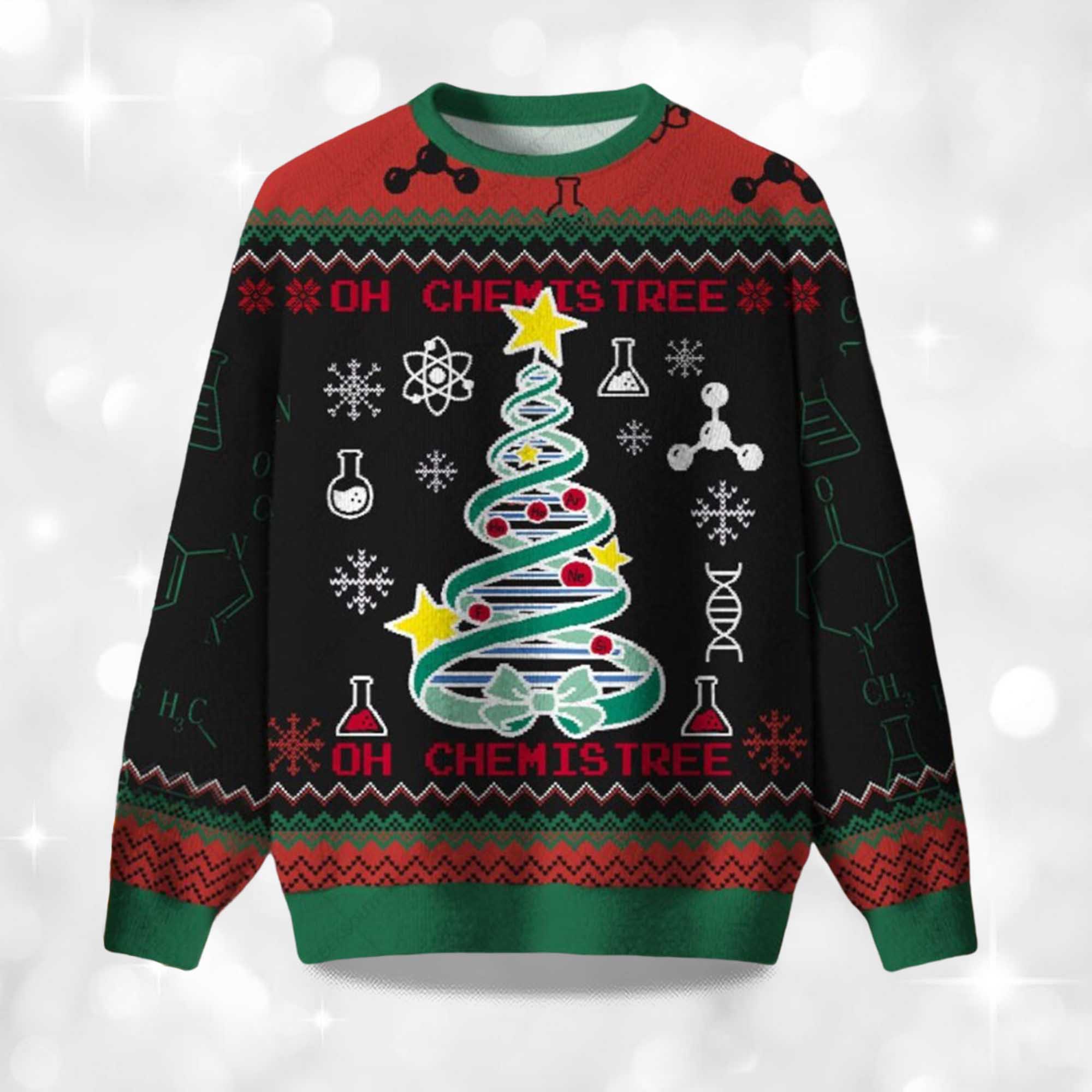 Digital knit art combines festive motifs and STEM imagery to create a unique sweater that stands out from the usual holiday designs. Snowflakes, glass cups, ring structures, and playful science drawings add layers of fun detail. The unisex style is comfortable and flattering, while the pops of color look great in group photos or ugly sweater contests. Durable stitching and high-resolution printing make this a perennial favorite during the holiday season.