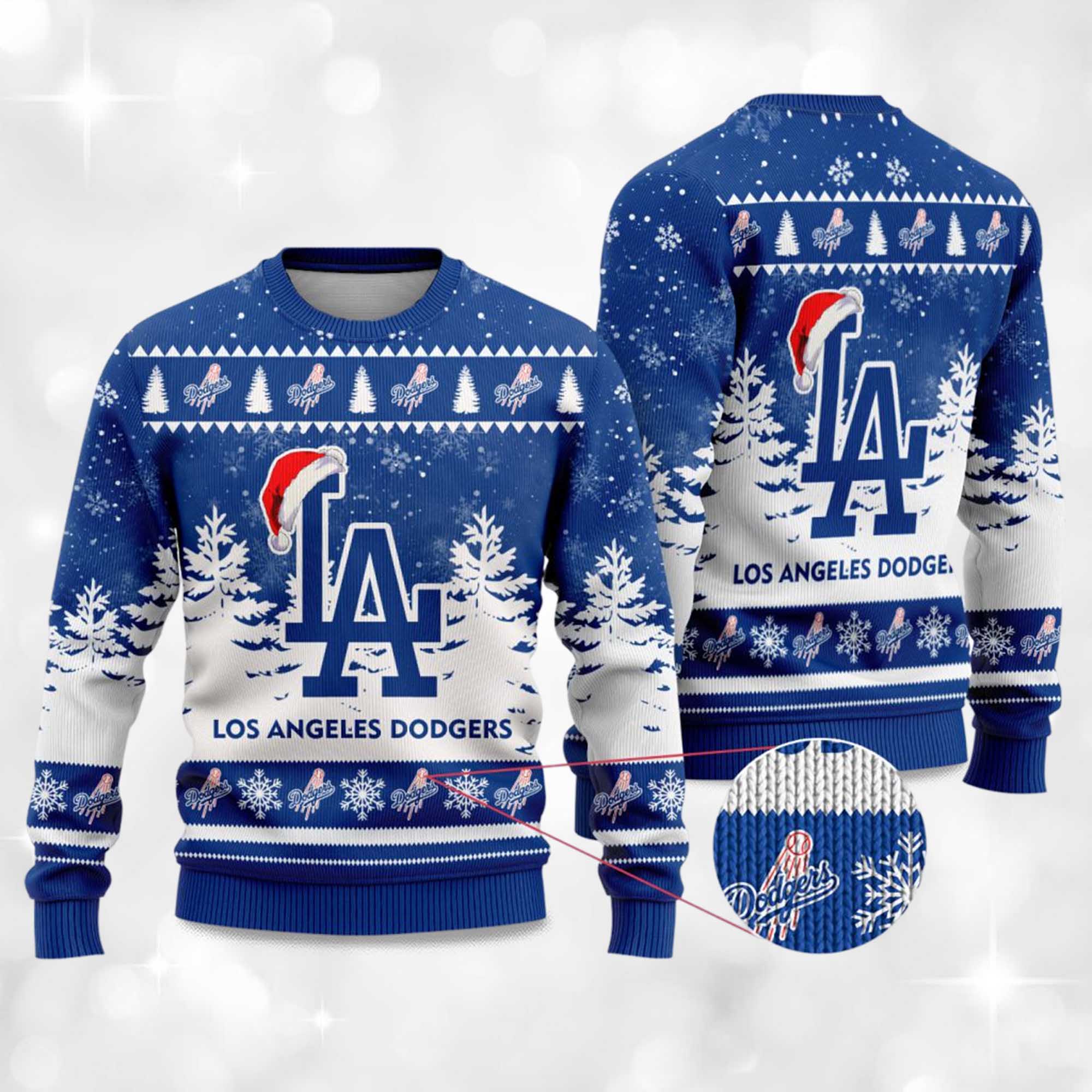 The 2025 Dodgers Snowflakes Christmas Ugly Sweater combines bright blue, crisp white, and playful seasonal prints for a cheery winter feel. The Los Angeles icon is accented with a Santa hat for a friendly holiday touch, while snowflakes and trees add a cozy charm to the design, perfect for gatherings and breezy December outings.