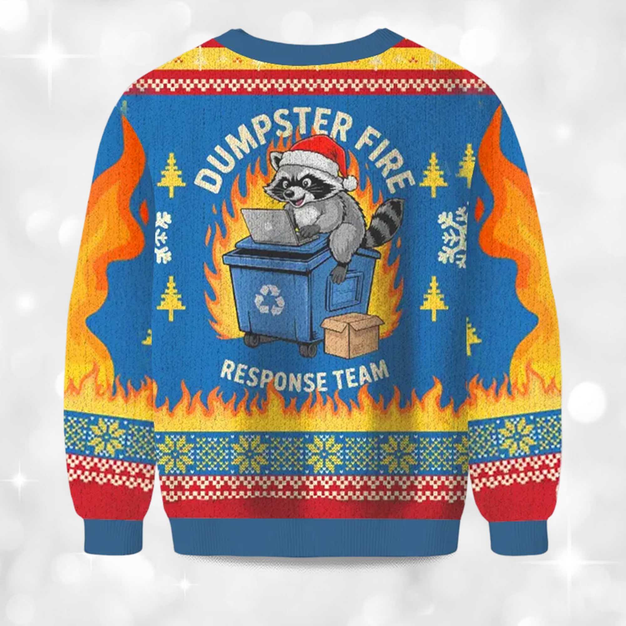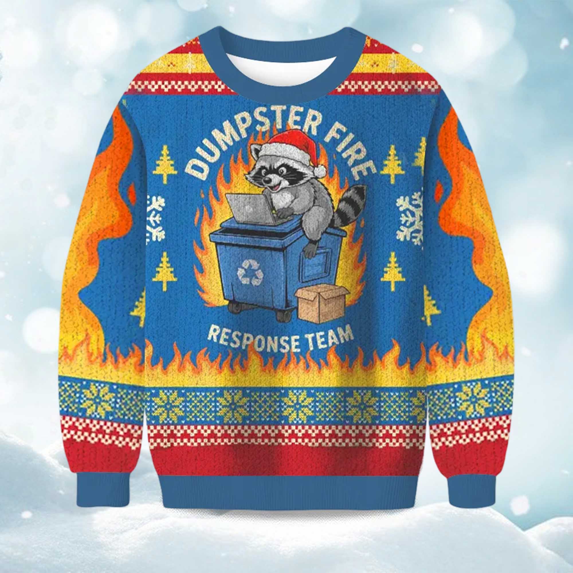 2025 Dumpster Fire Response Team Raccoon Christmas Ugly Sweater represents the perfect blend of comedy and Christmas spirit. Featuring a mischievous panda typing on a burning dumpster, the design turns everyday chaos into festive entertainment. The glowing flames, striking winter motifs, and vibrant blue backdrop create an instantly memorable look that is sure to bring a laugh to any gathering.