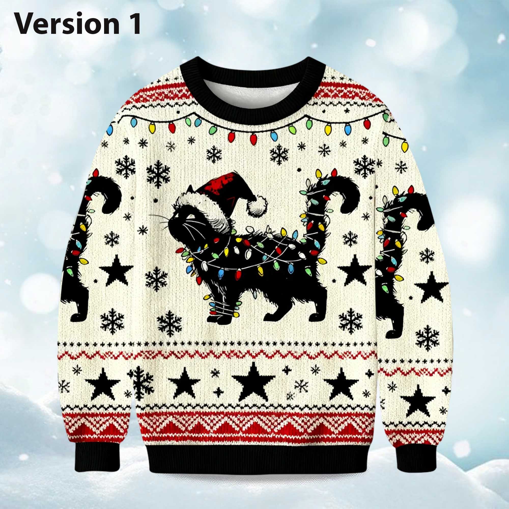 2025 Funny Cute Cat Christmas Ugly Sweater offers a playful mix of festive charm and lighthearted humor. Featuring a black cat adorned with brightly colored lights and a cute little Santa hat, the sweater feels lively and warm. Snowflakes, stars, and knitted motifs complete the look, making it ideal for parties, family photos, or cozy winter days.