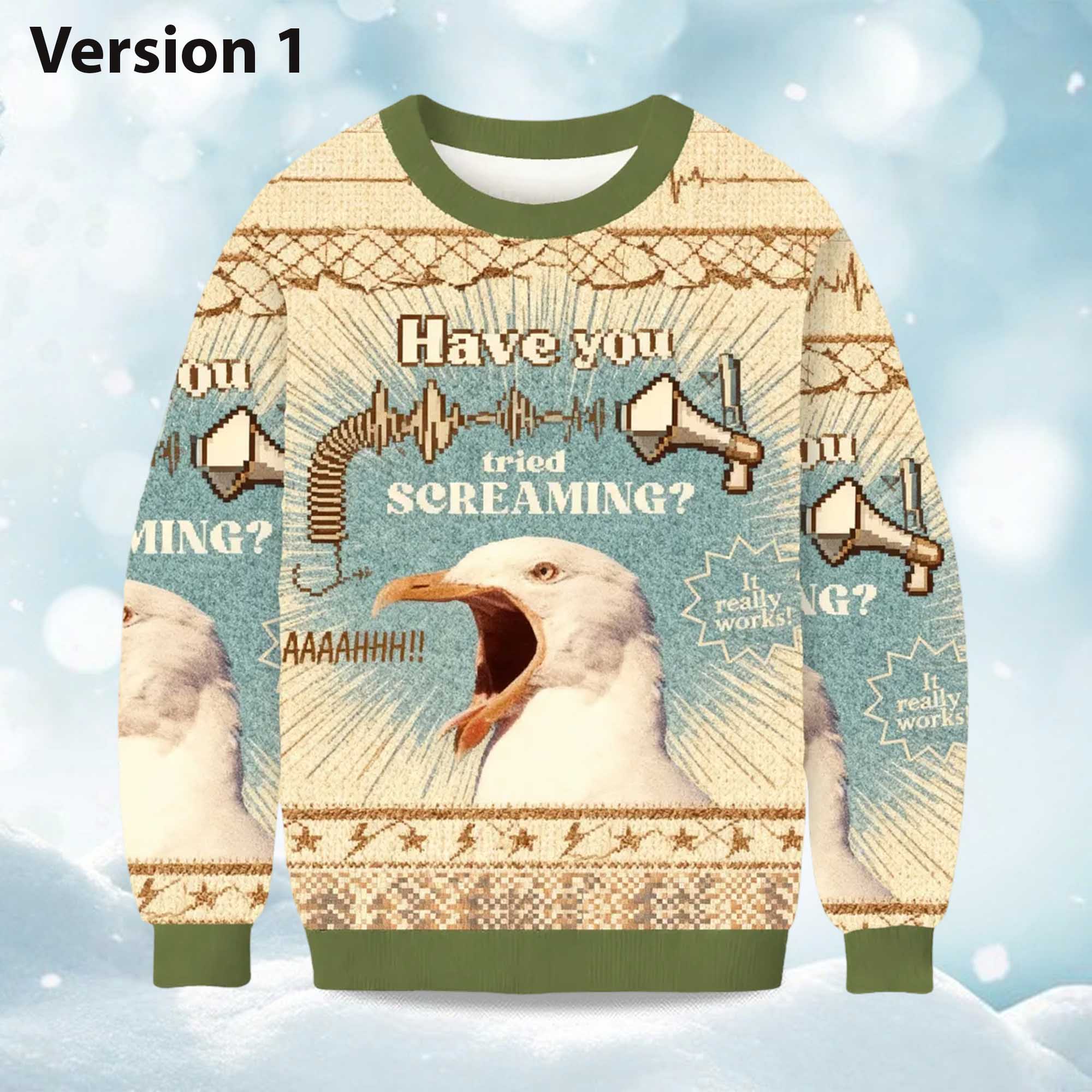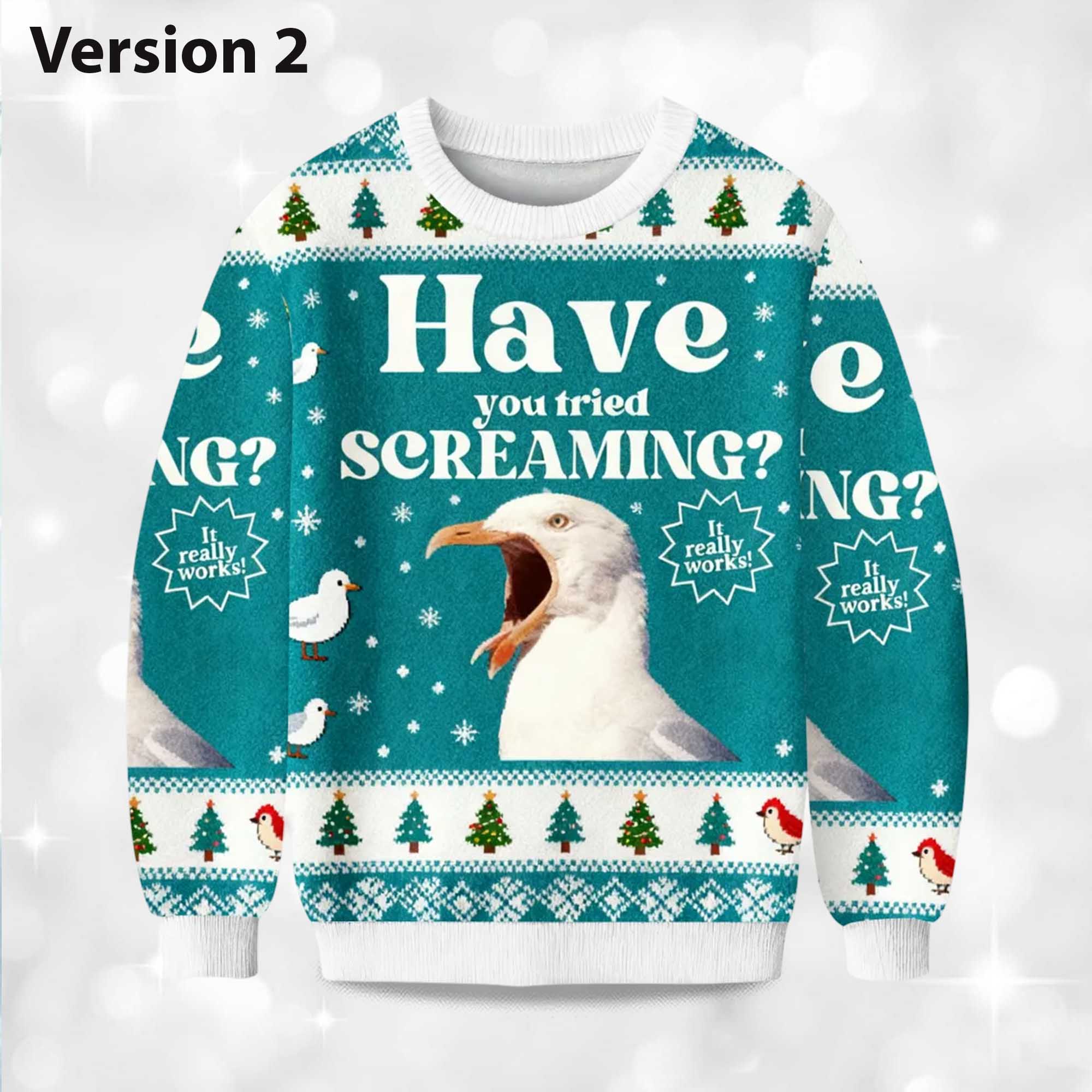 The 2025 Have You Tried Screaming Christmas Ugly Sweater captures the relatable chaos of the holiday season. Featuring a wide-mouthed seagull screaming “AAAAHHH!!!”, a playful megaphone print and classic holiday motifs, this design delivers an instant laugh and blends the end-of-year energy in the most fun way.