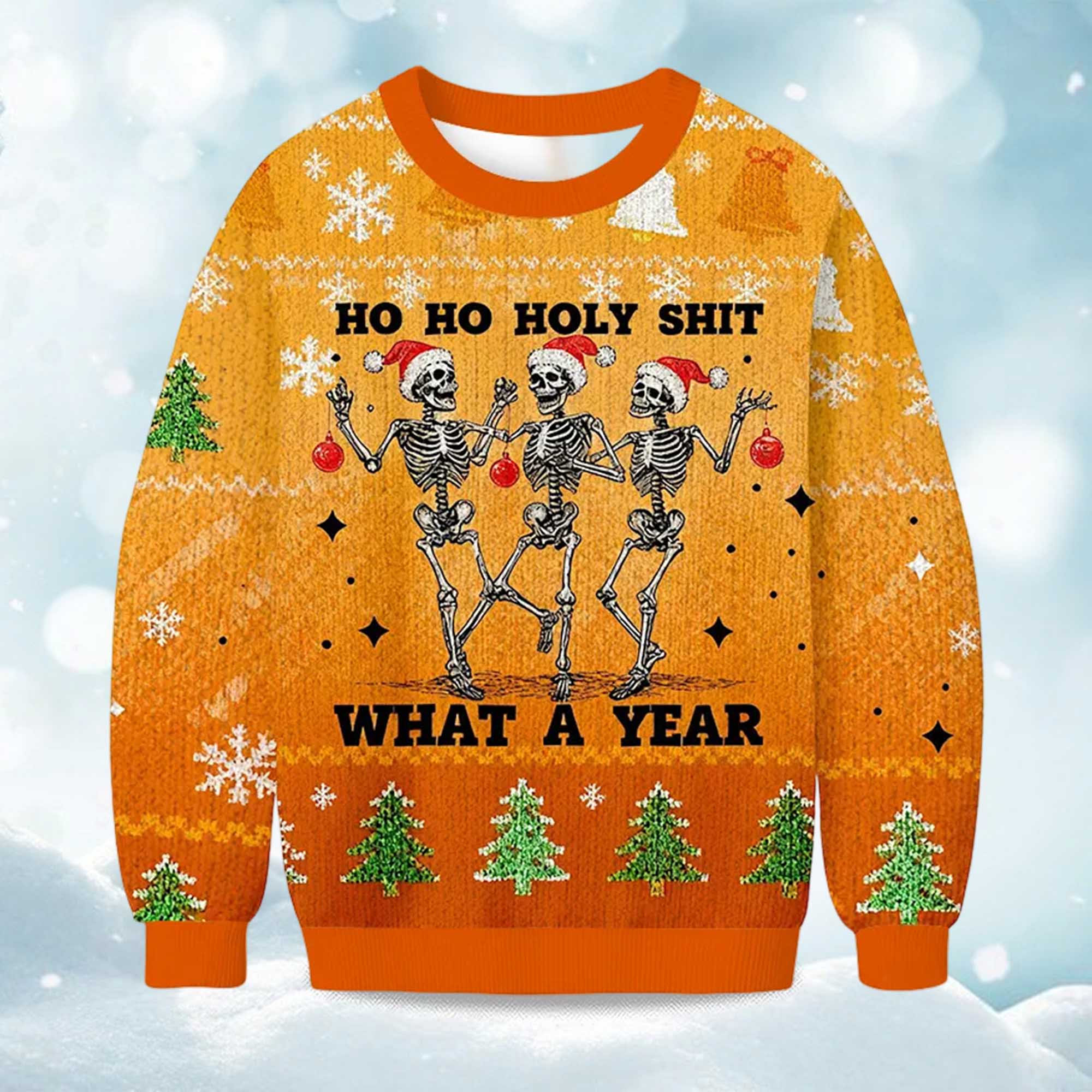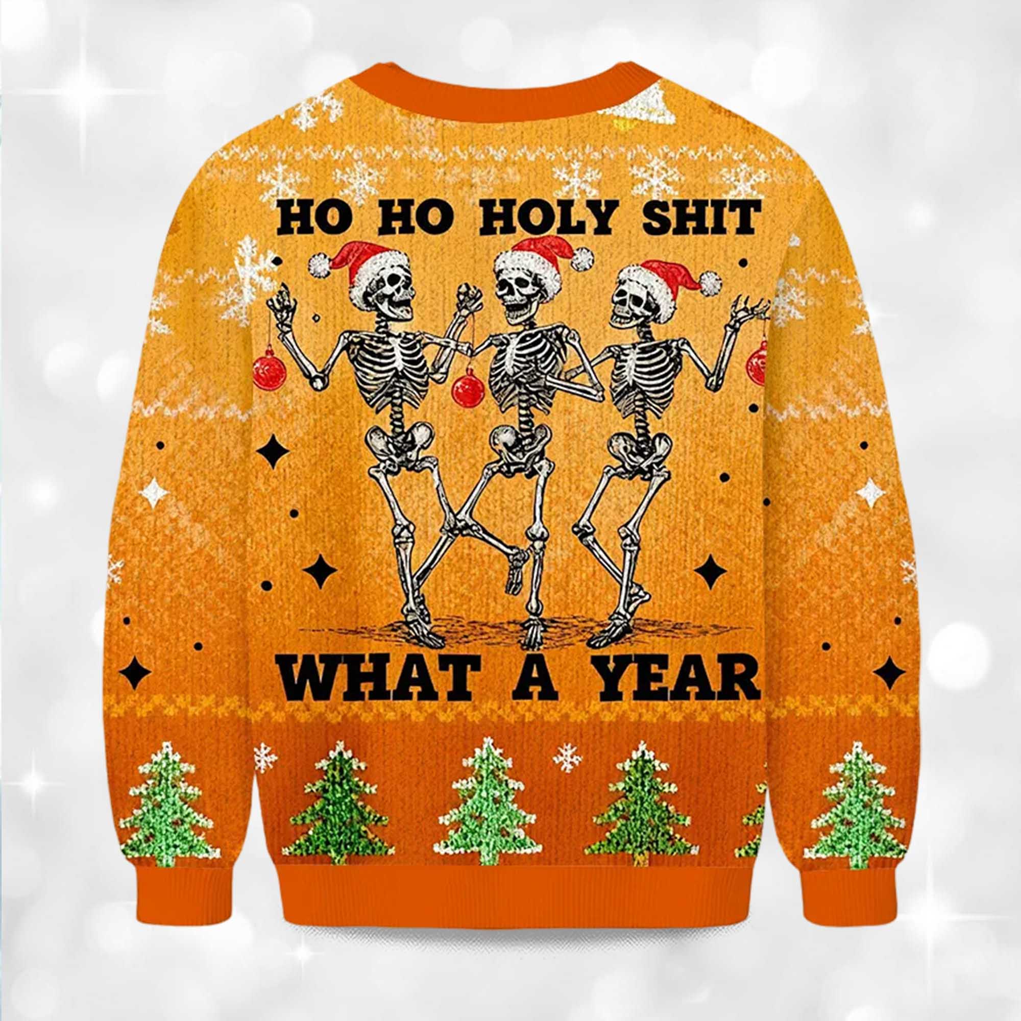 The 2025 Ho Ho Holy Shit What A Year Christmas Ugly Sweater is a sweater that will instantly make you laugh with its vibrant orange backdrop, hilarious skeleton characters, and unabashedly festive message. This sweater is perfect for those who like to express humor in their winter wardrobe and aren’t afraid to stand out.