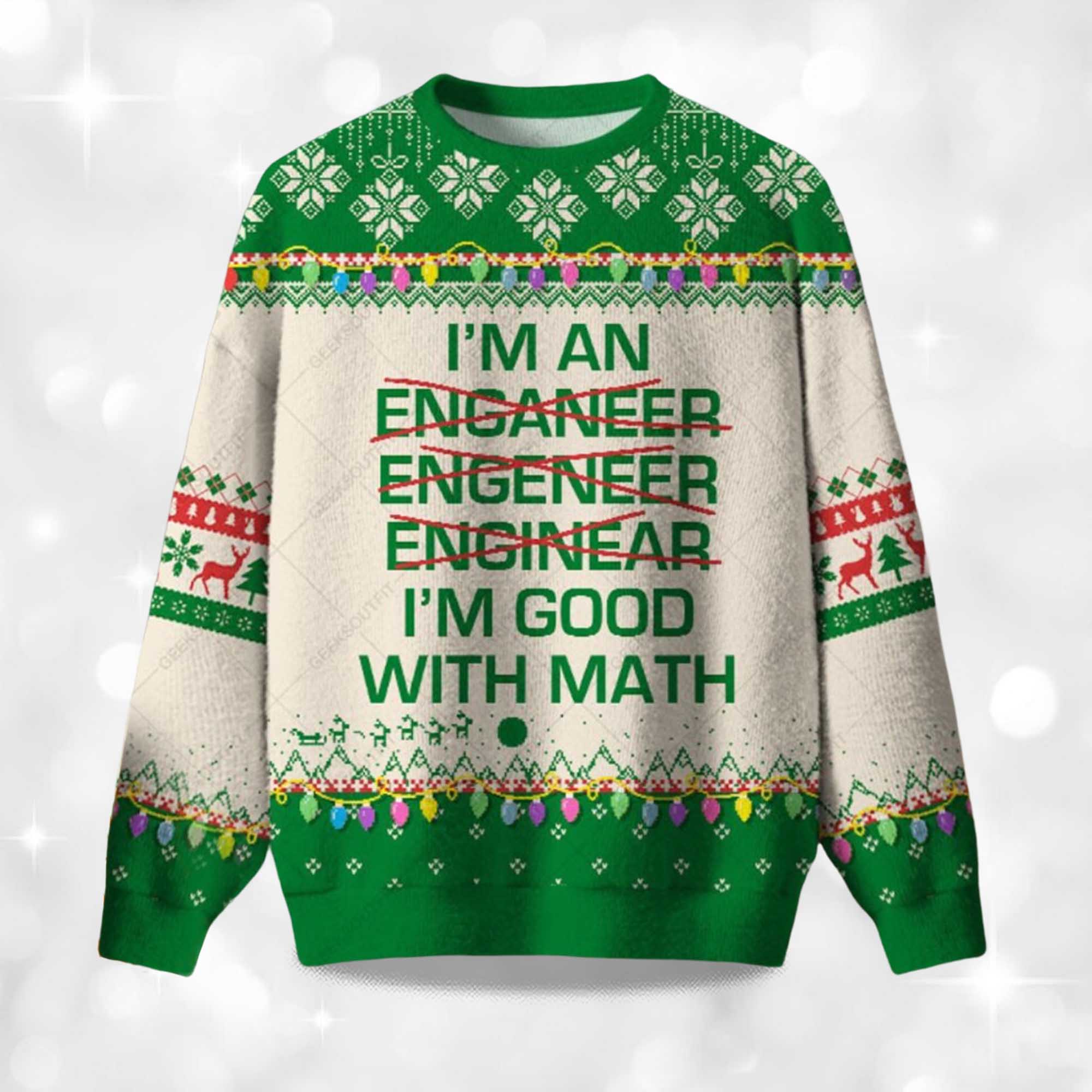 The 2025 I Am Good With Math Ugly Christmas Sweater brings a witty academic style to holiday fashion. With the phrase “I AM AN ENGINEER / ENGINEER / ENGINEER” crossed out multiple times before writing “I AM GOOD AT MATH,” this sweater turns spelling mistakes into humorous stories. Combined with the traditional green, white, and red festive motif, the sweater stands out as the perfect blend of festive cheer and witty humor.