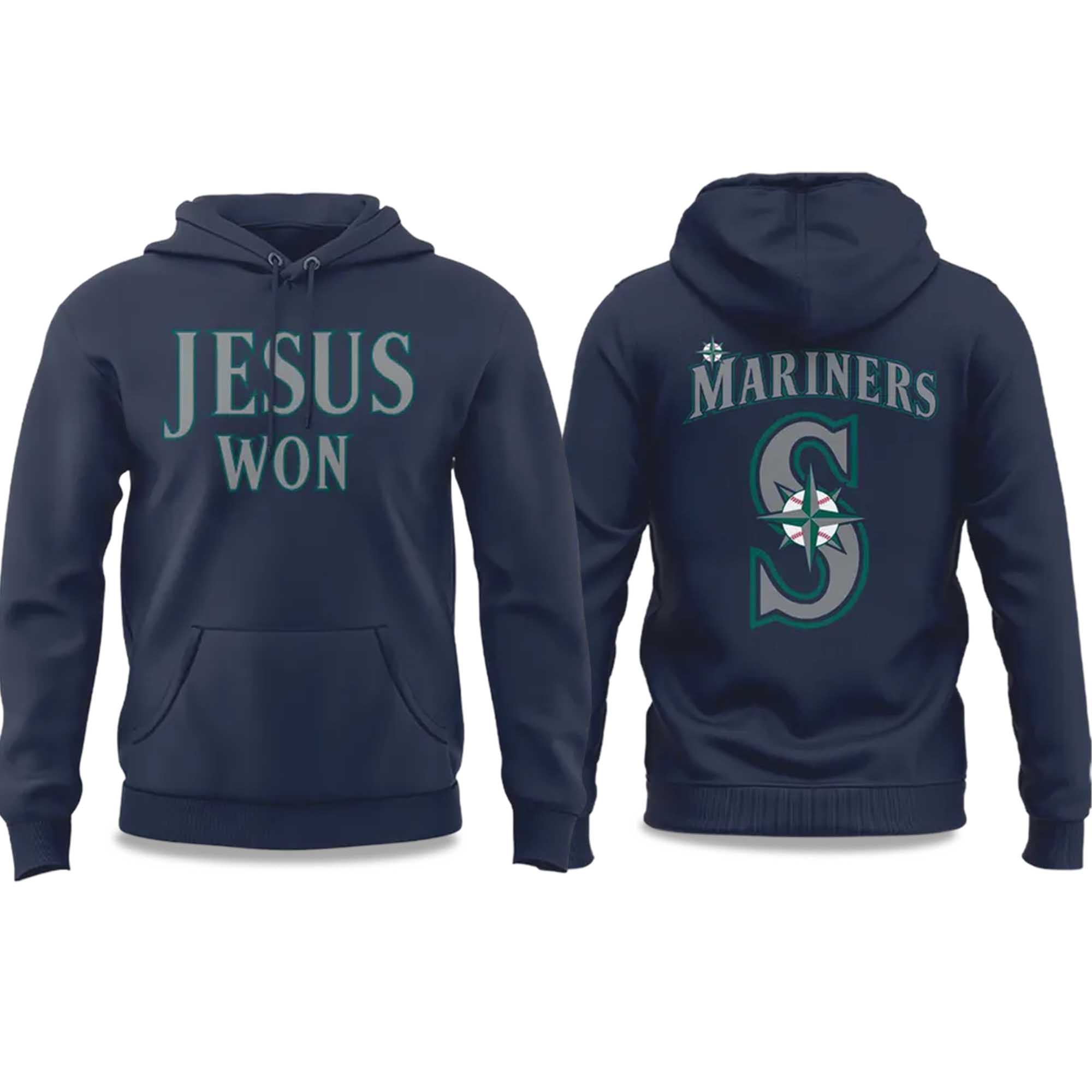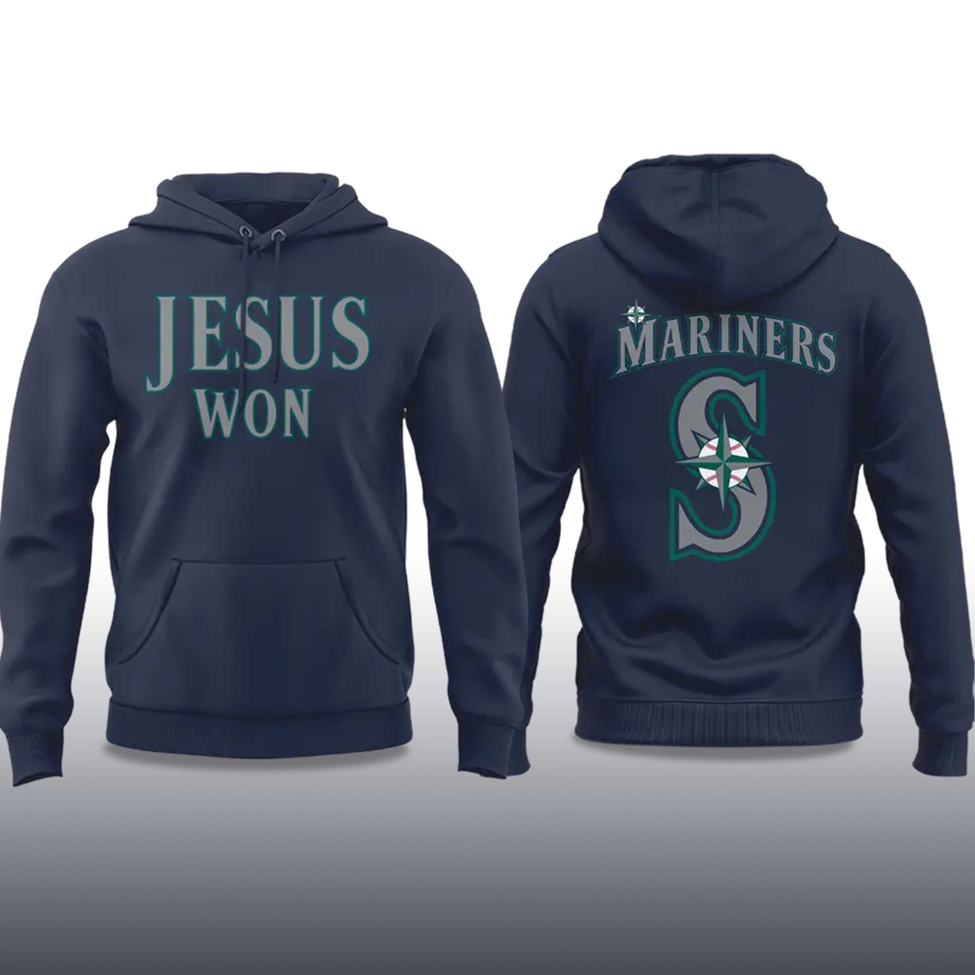 The hoodie features a dark navy body with “JESUS WON” in dark teal on the front. The back boasts the Seattle Mariners’ signature S” logo and “MARINERS” curved on the shoulders. The design is clean, sharp, and recognizable, perfect for layering on chilly game nights. Roomy front pockets and an adjustable hood add warmth