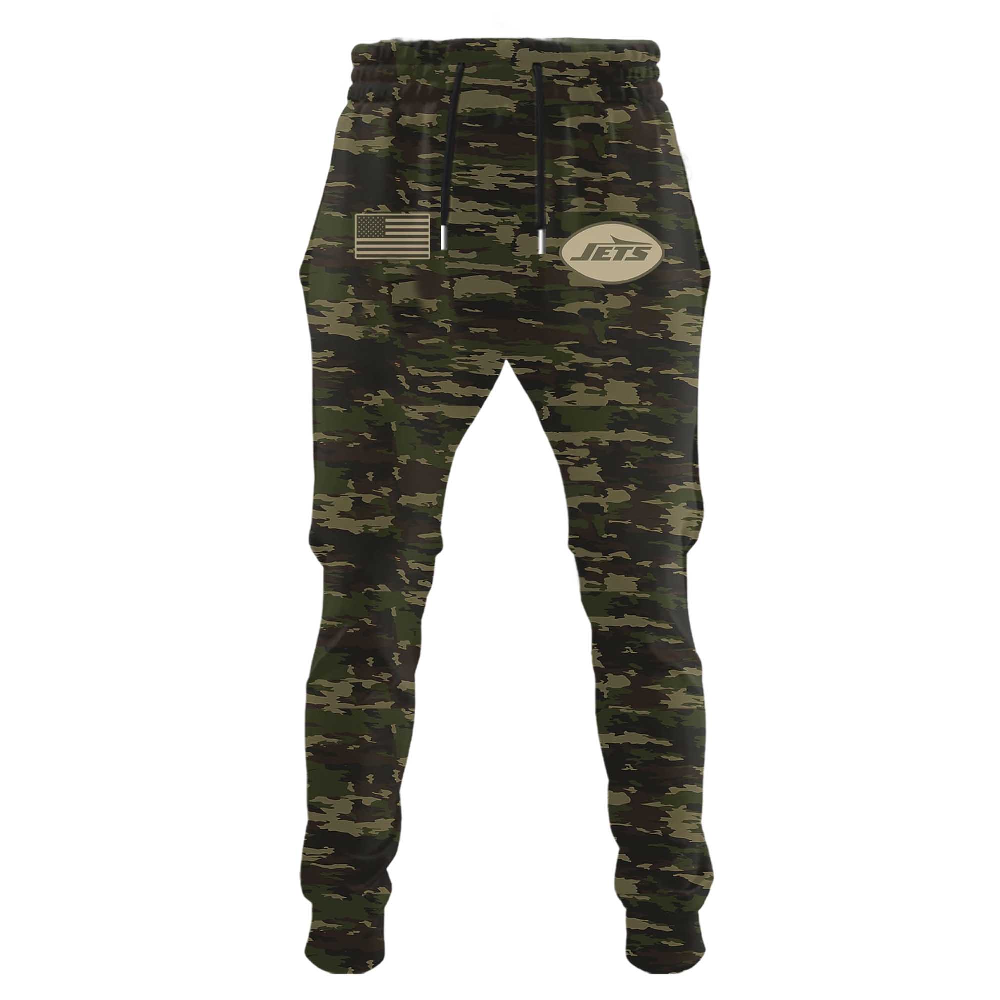 The 2025 Jets Salute to Service Camo Hoodie offers a powerful combination of tactical camouflage and iconic team branding. With a deep blue color scheme, flag-inspired details, and large Jets logos on the front and back, this hoodie reflects the loyalty, resilience, and pride that fans carry with them through each season.