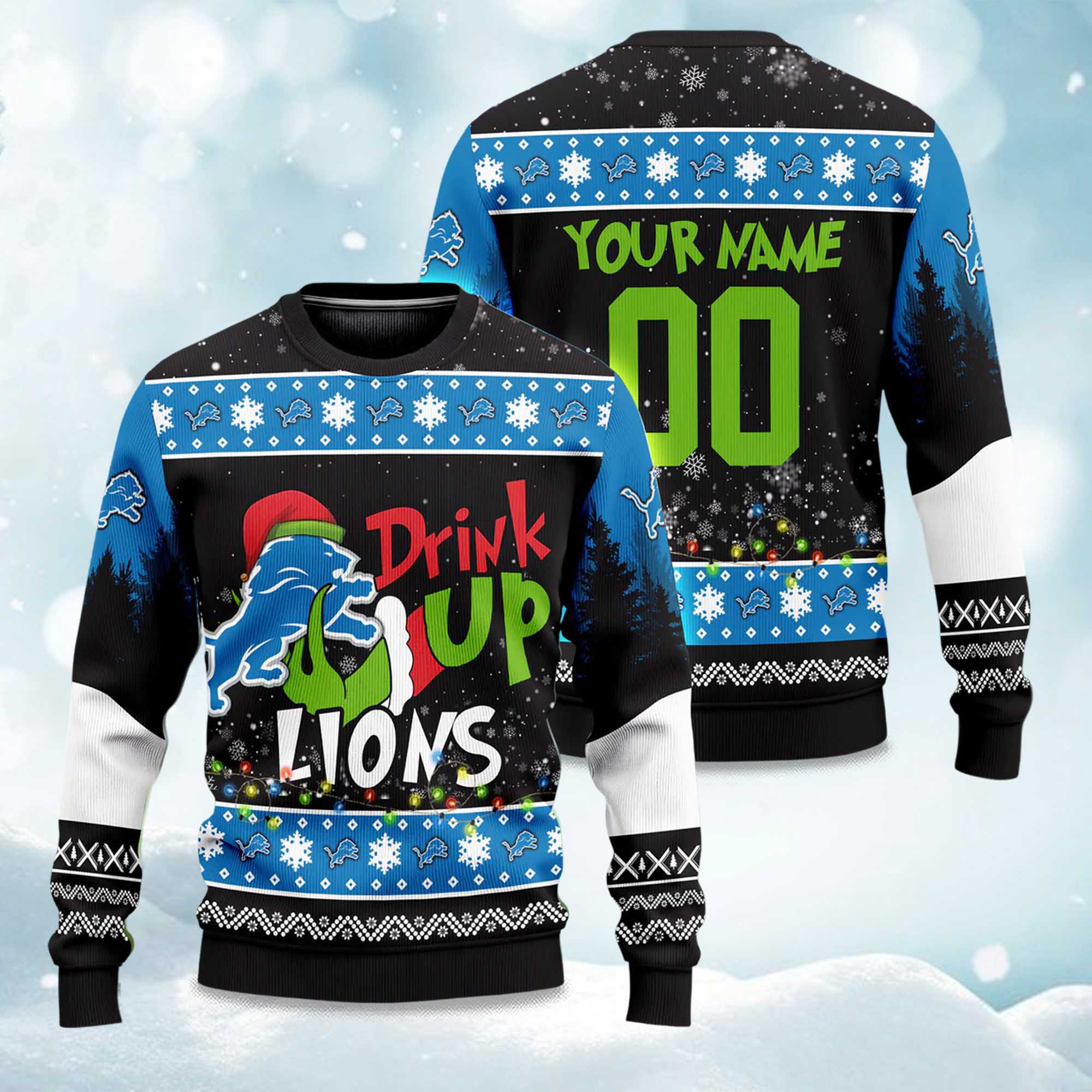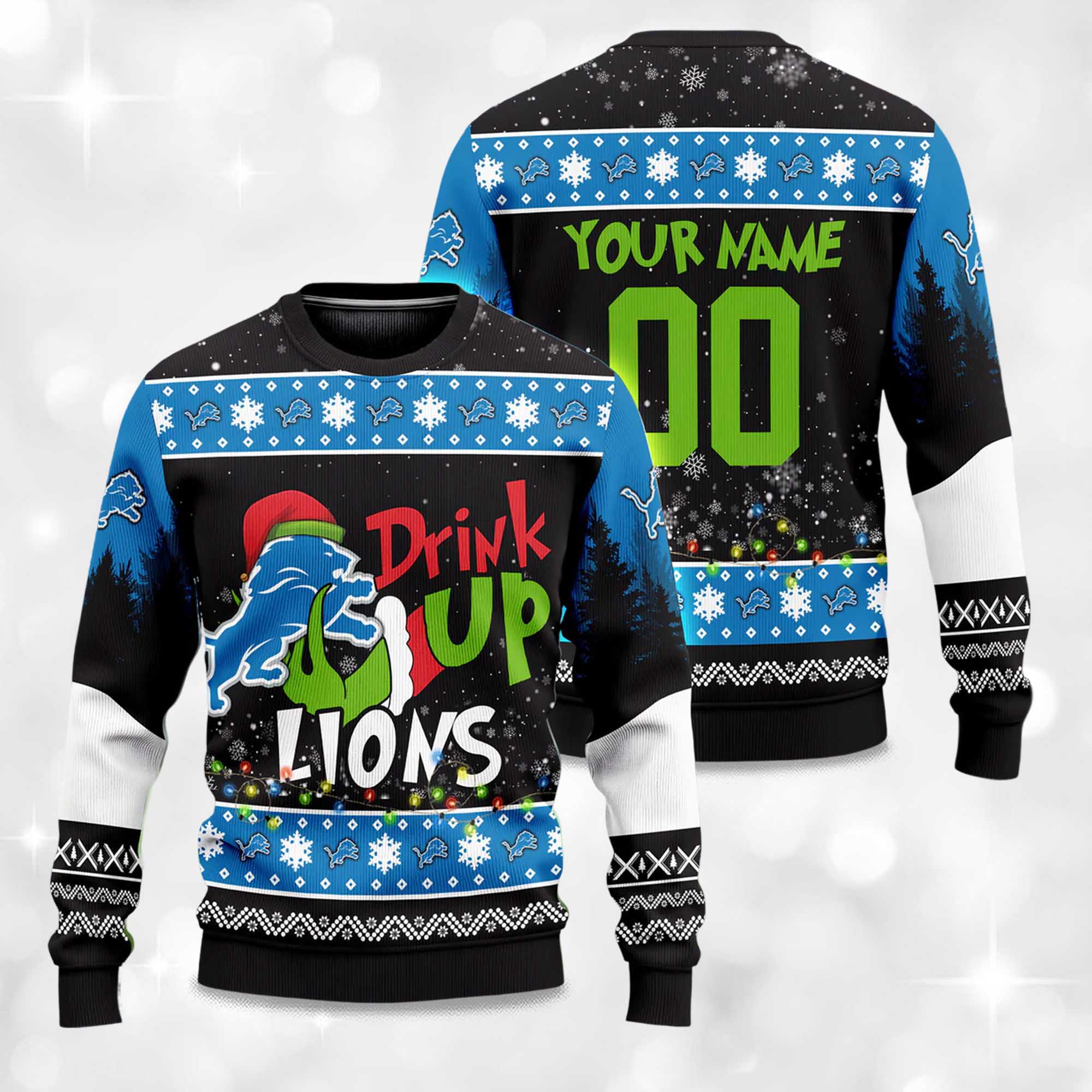 Lions Drink Up Grnch 2025 Christmas Ugly Sweater – Christmas Joy for Detroit Fans