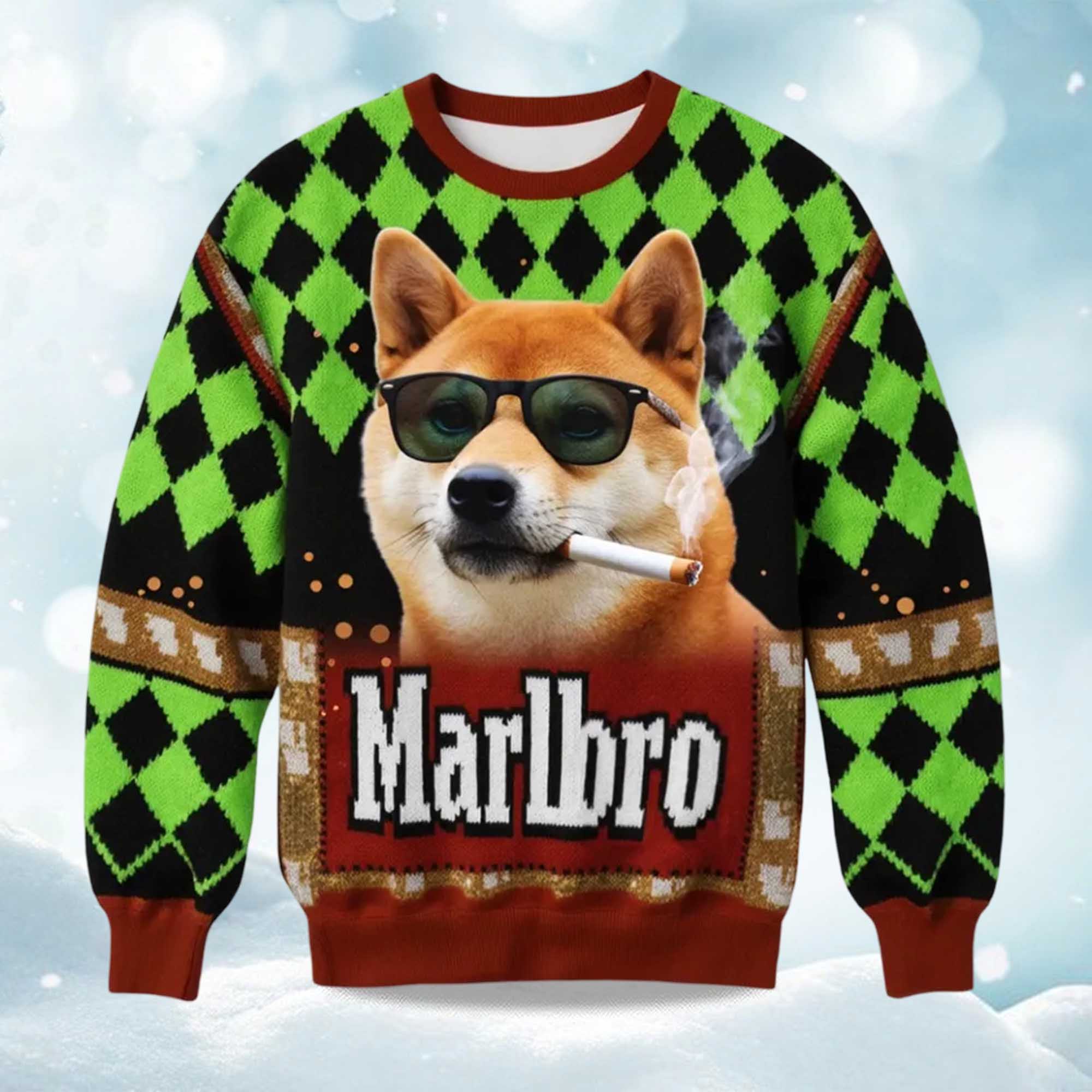This design taps into the meme-inspired holiday wear trend. The playful dog image, combined with a familiar parody layout, reflects the humor and nostalgia of the internet. It’s not about cigarettes, but the combination of serious aesthetics and carefree animal imagery makes it a top choice for those who love a little humor.