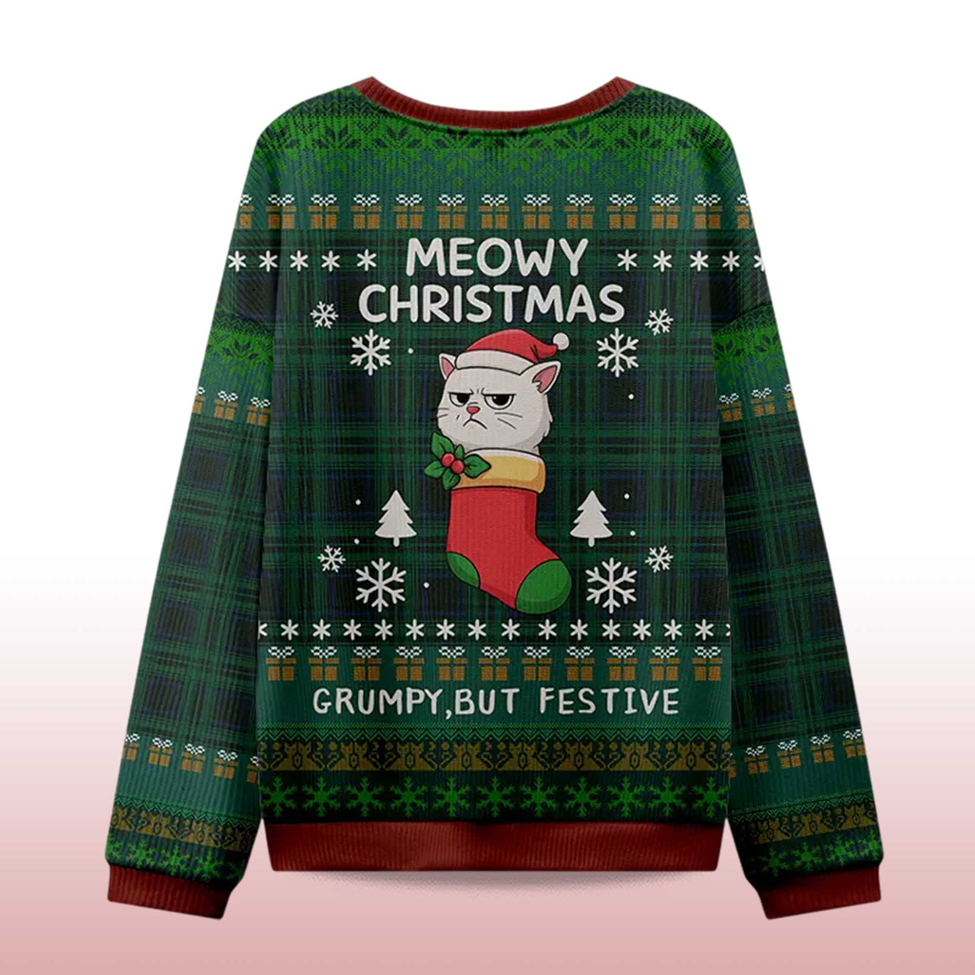 This sweater combines the classic Christmas plaid with snowflakes, trees, and presents, all in vibrant green and red tones. The center image features a grumpy white cat wearing a Santa hat, resting in a red stocking beneath the words MEOWY CHRISTMAS. Below, the words Grumpy, but Festive” perfectly capture the holiday spirit. Soft wool keeps you warm and cozy through long winter nights, while the ribbed collar, hem, and cuffs provide the perfect fit. The design is printed in vibrant, colorfast colors, keeping it bright year after year.