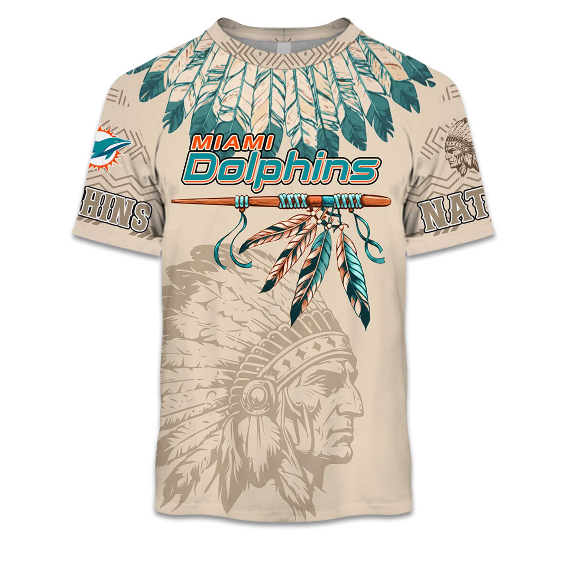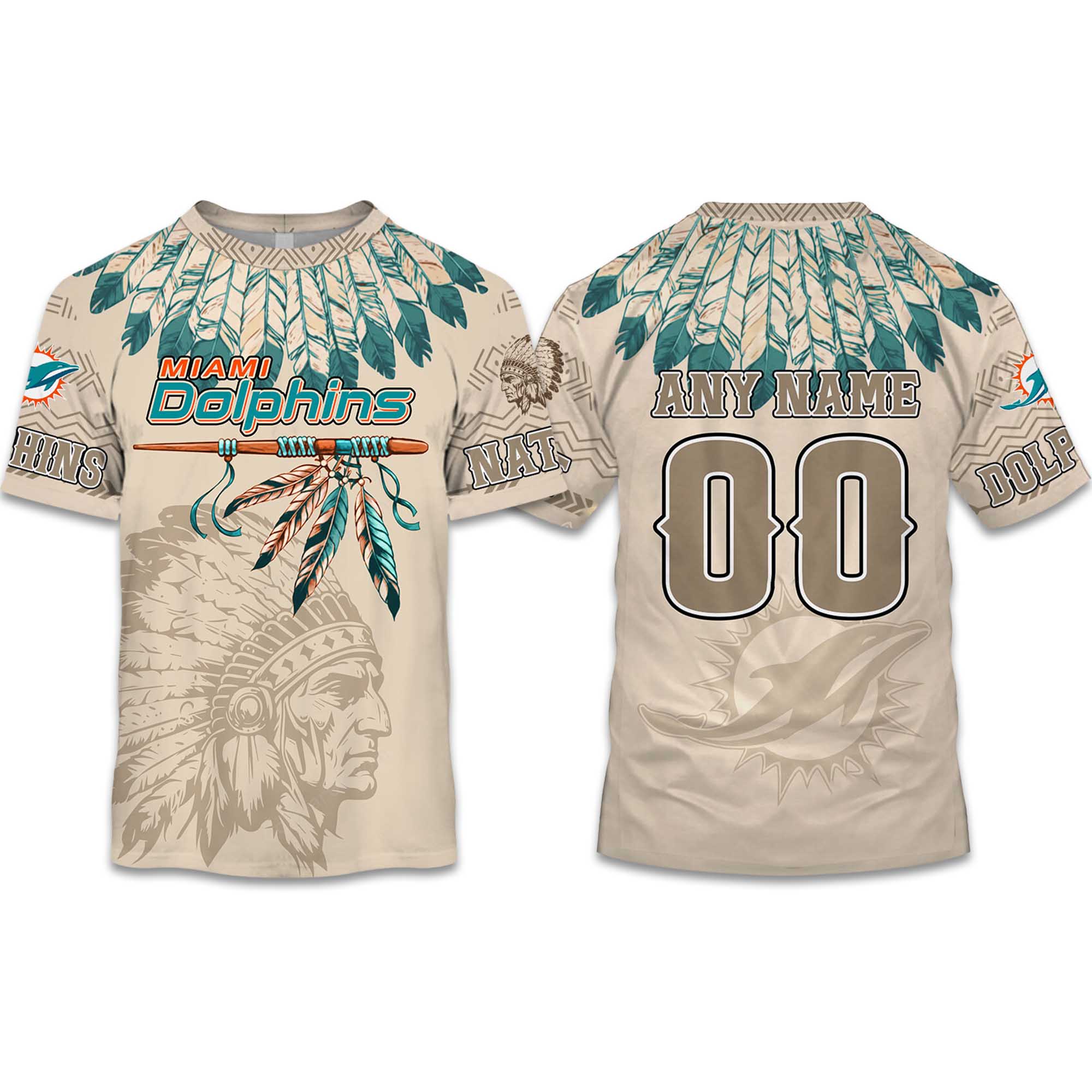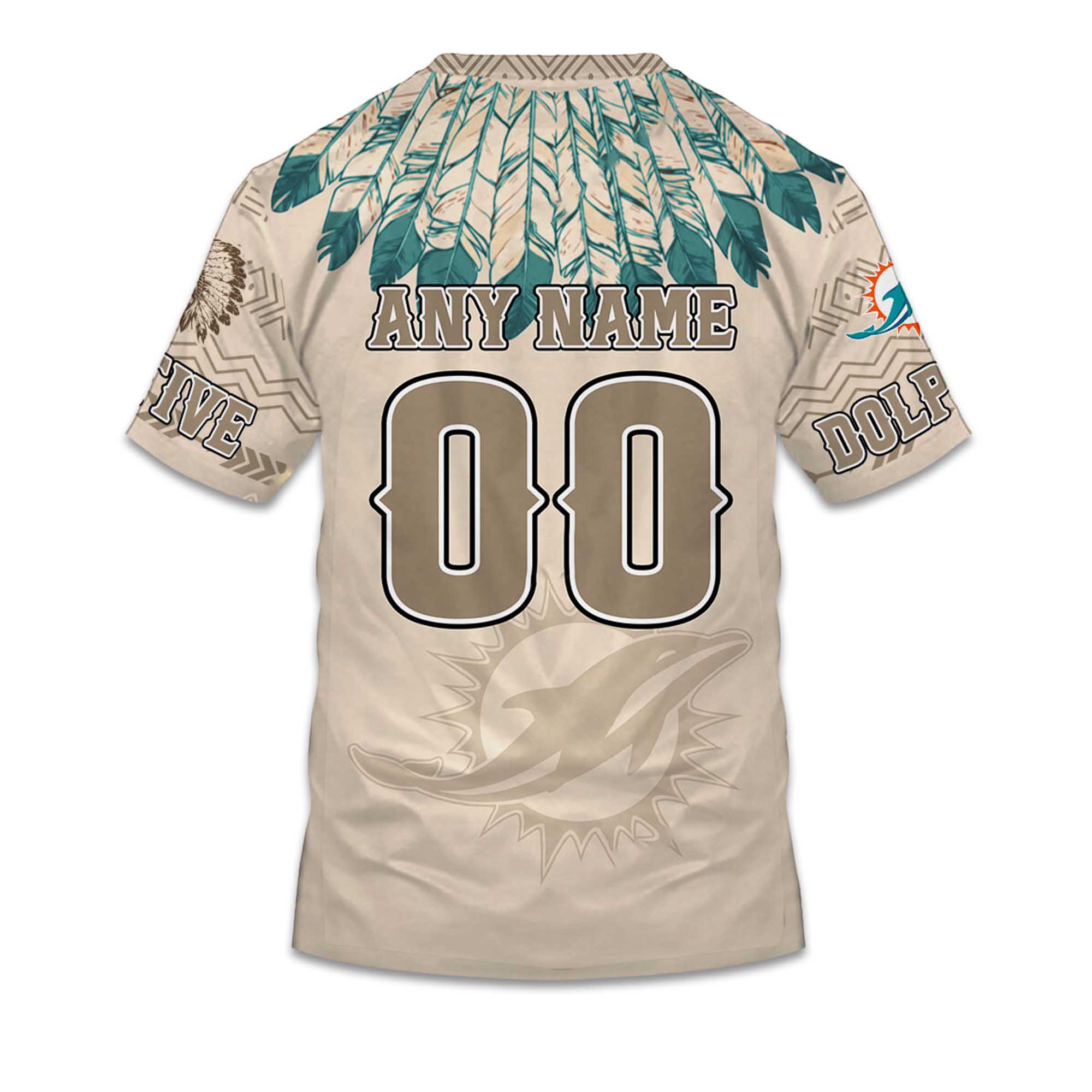 The design combines the Dolphins brand with Native American-inspired feather elements, adding depth and movement. Personalization options make each shirt unique, while the smooth print surface ensures long-lasting clarity. Breathable fabric keeps the shirt comfortable, suitable for warm weather and athletic activities.