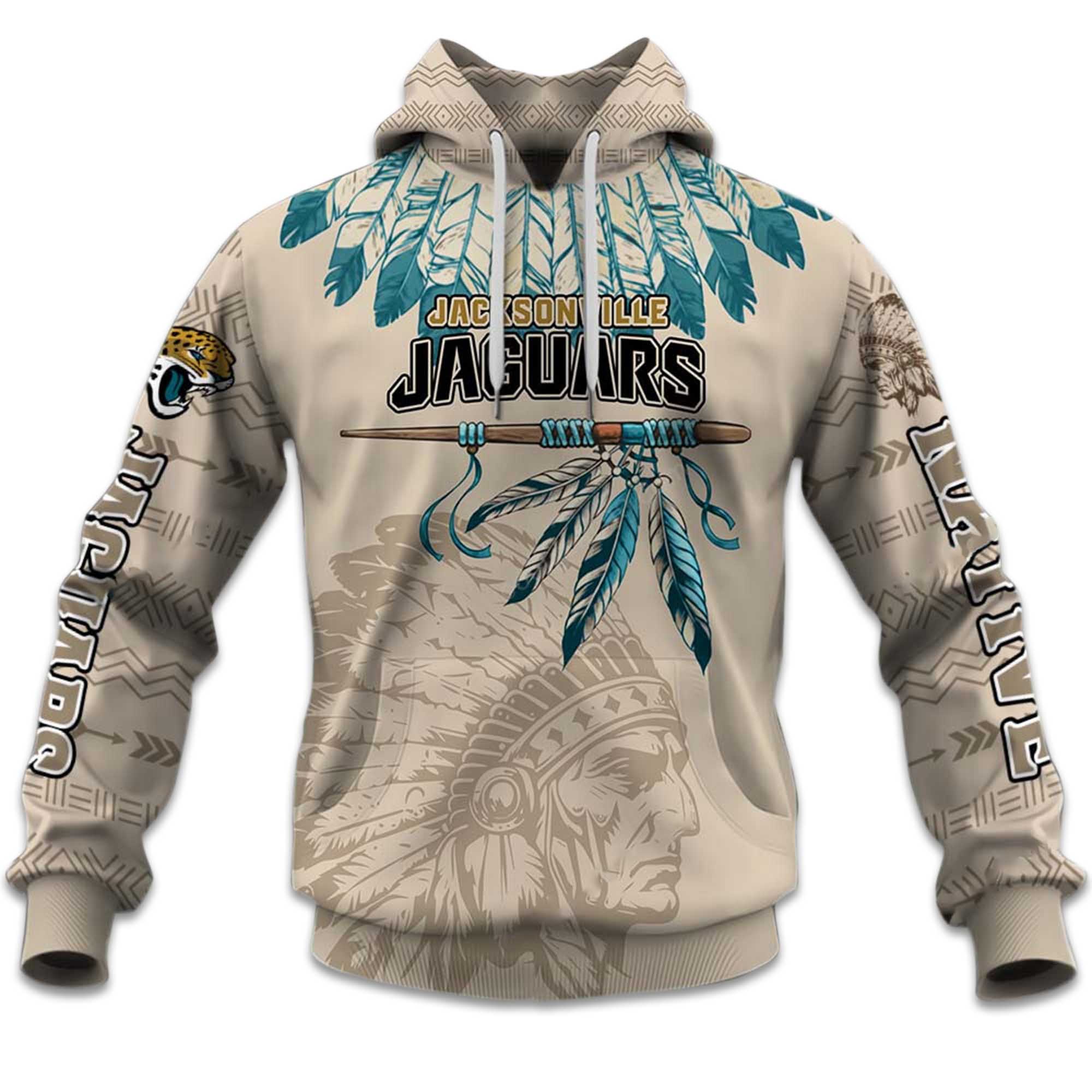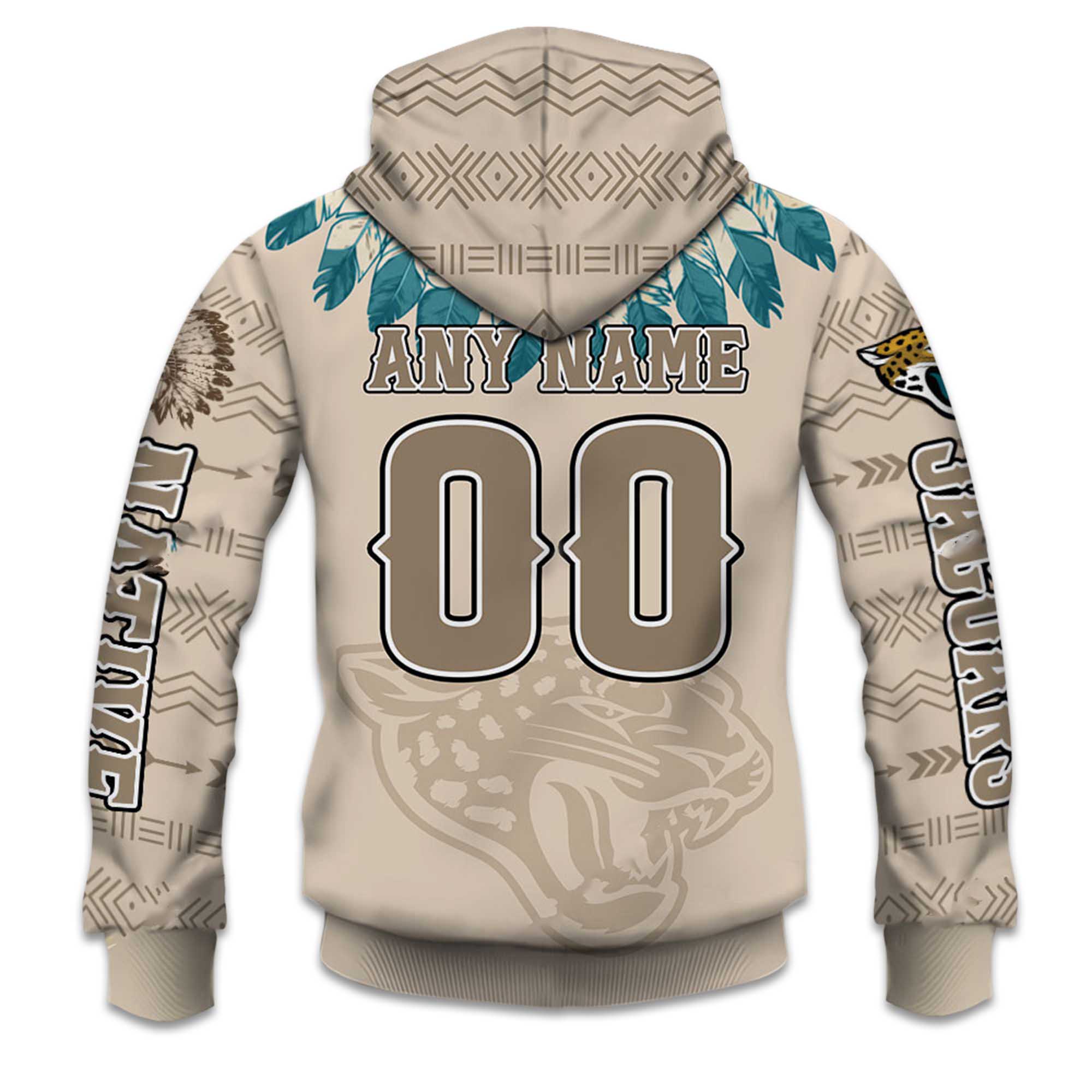 The design combines Jaguars team identity with Native American-inspired feather elements, adding depth and movement. Personalization options make each hoodie unique, while durable stitching supports long-lasting use. Breathable material balances warmth and comfort, making this hoodie suitable for outdoor activities, travel, and relaxed everyday wear.