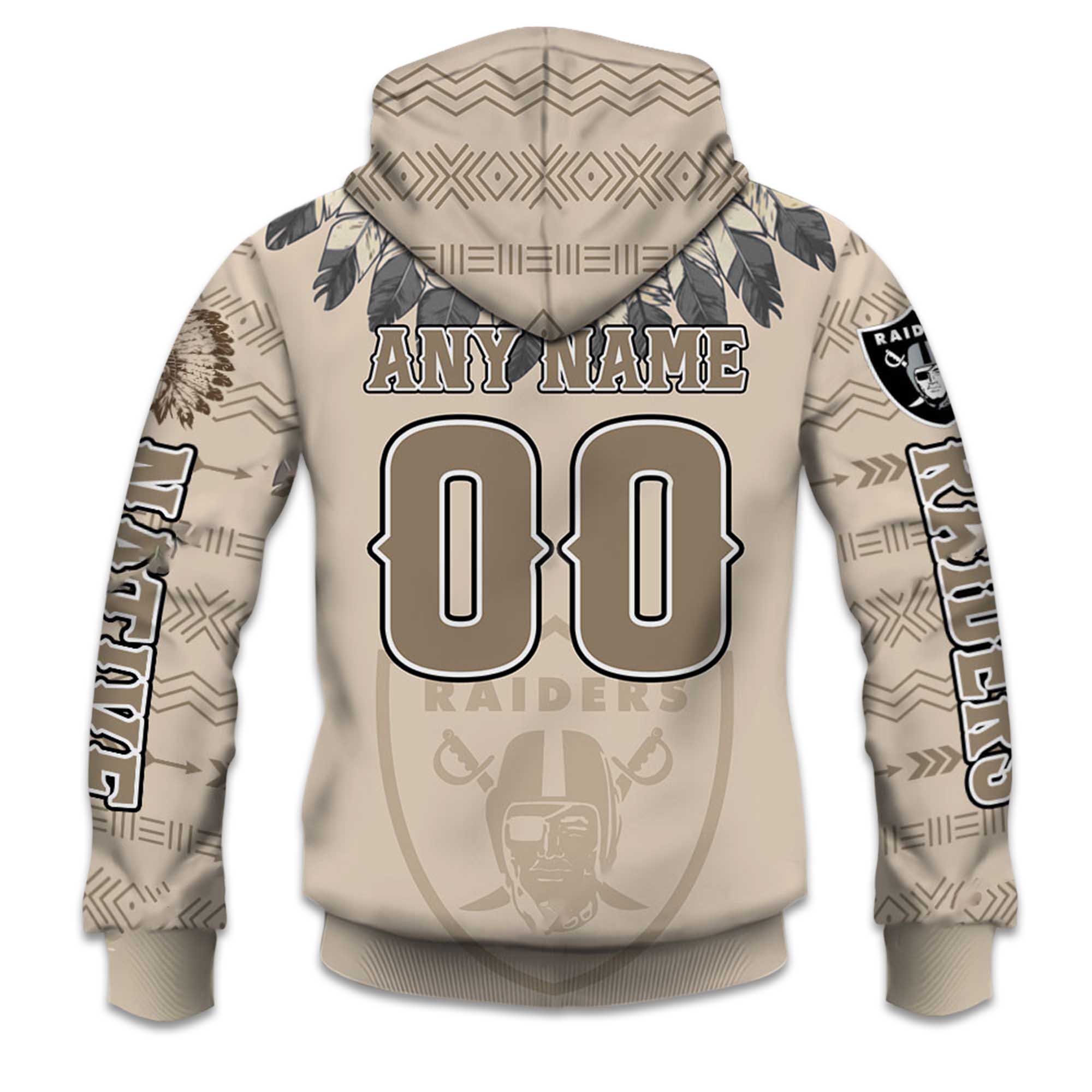 The feather imagery symbolizes strength, protection, and resilience, values that align well with Raiders culture. Tribal patterns on the sleeves add balance and depth, while the loose fit allows for easy movement. Personalization elements on the back give the hoodie a unique feel that typical fan apparel often lacks.