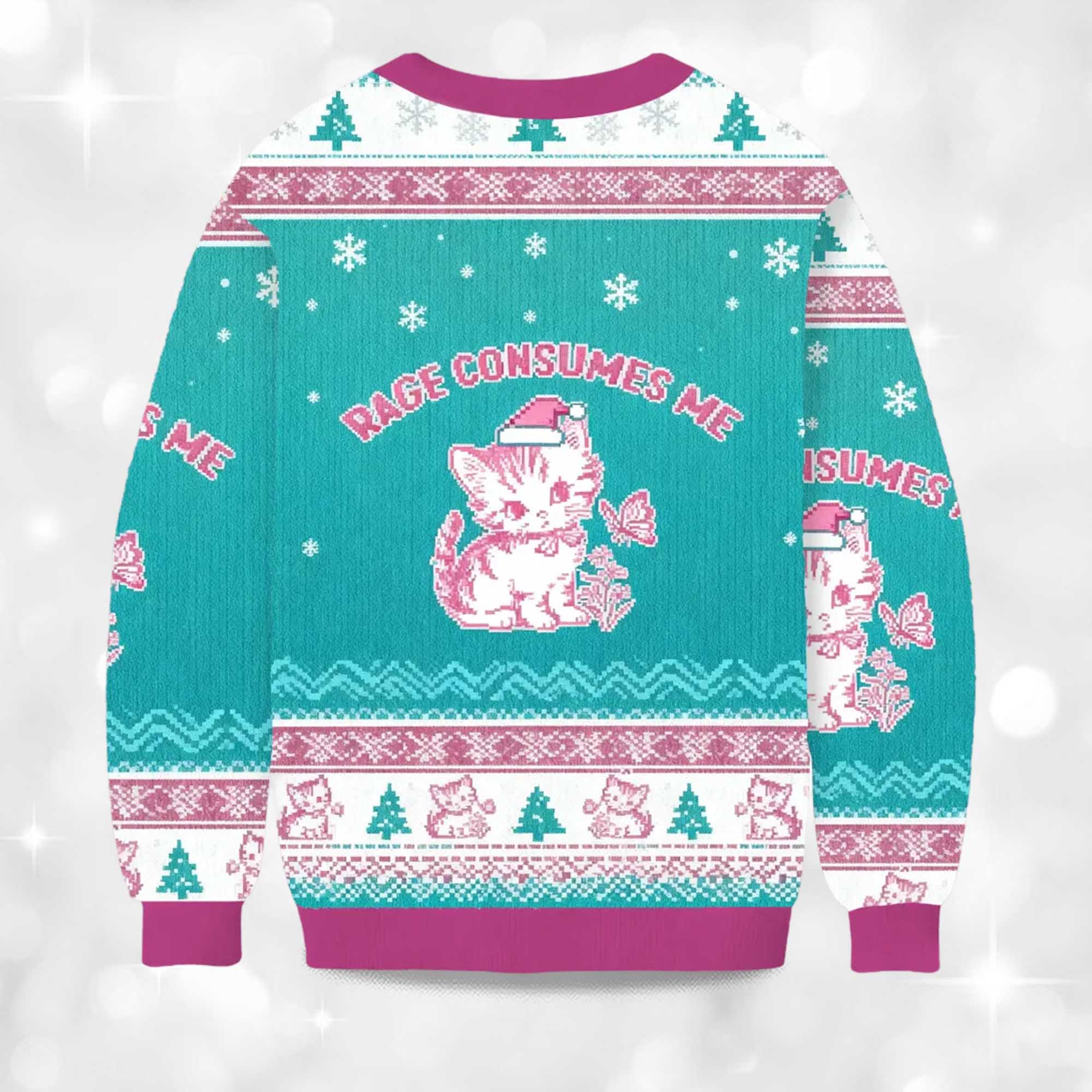The 2025 Rage Consumes Me Christmas Ugly Sweater combines bright colors, festive prints, and fun, bold kitten illustrations. The turquoise and pink color palette brings a cheerful winter feel, while the cheeky slogan adds a touch of humor, perfect for parties, photos, and anyone who loves a mix of sweetness and sarcasm during the holiday season.