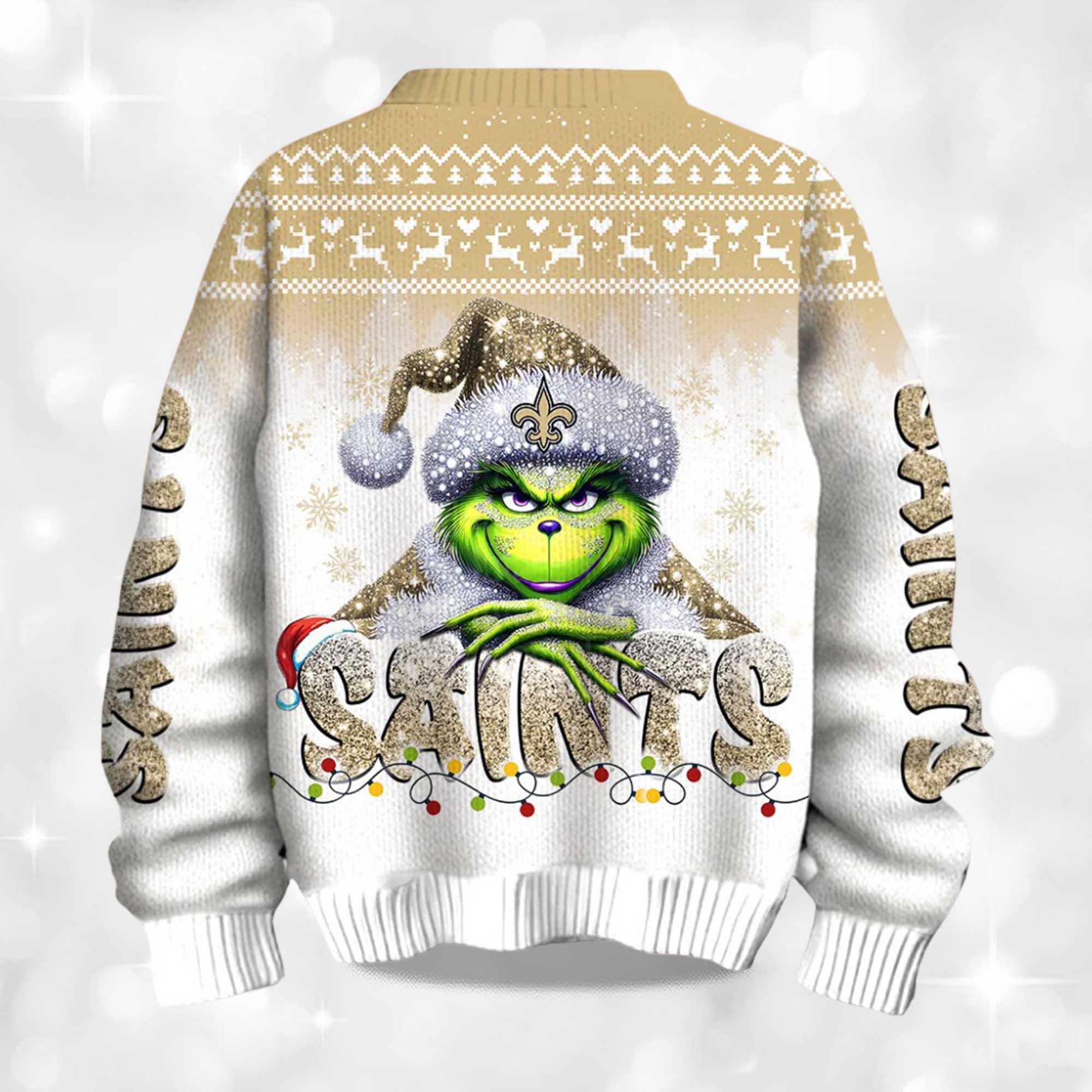 This sweater uses a warm mix of gold, white, and winter motifs on the upper body, while the bold green cartoon character in the middle adds a touch of humor and personality. Glittery textures, festive lights, and large “SAINTS” lettering create a vibrant, eye-catching composition. The sleeves are also decorated with team-inspired graphics, giving it a 360-degree festive look. The knit fabric is soft, cozy, and cozy enough for cold-weather gatherings.