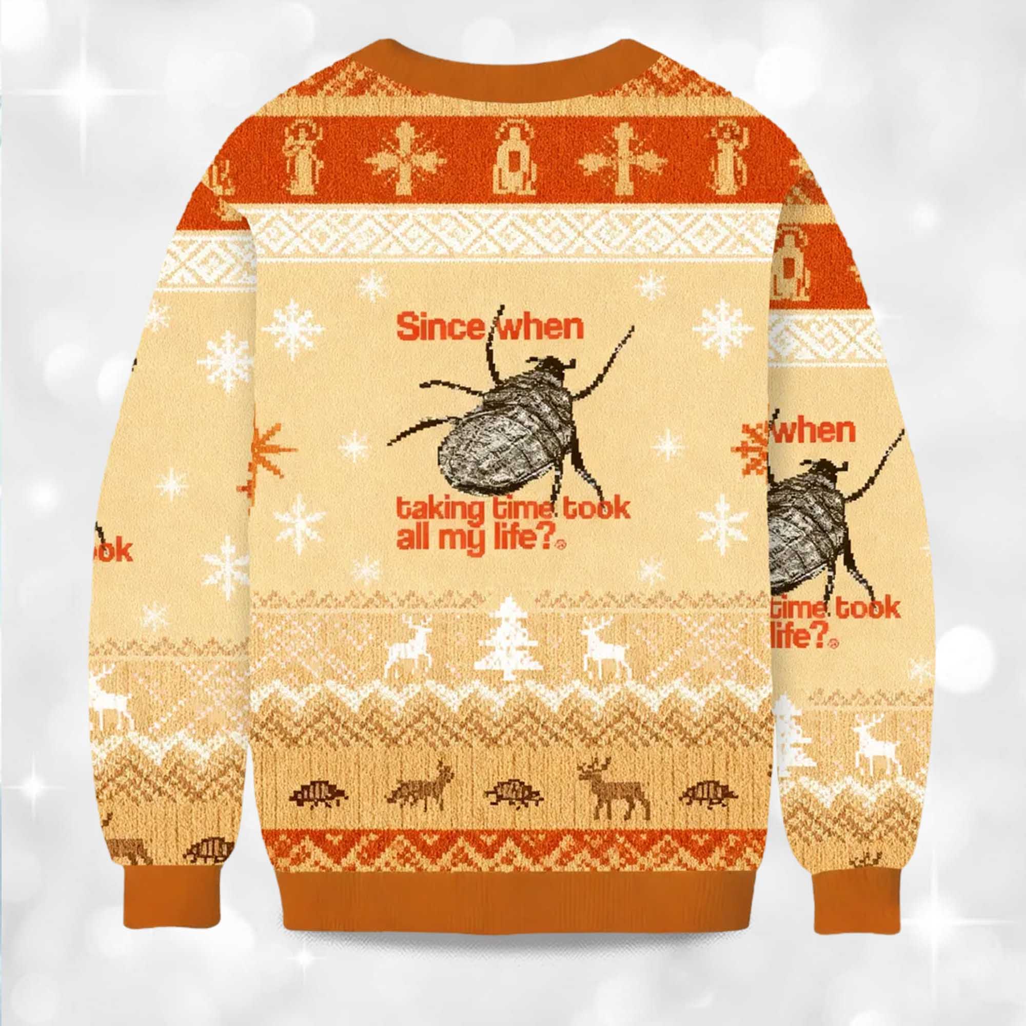 The 2025 Since When Taking Time Took All My Life Christmas Ugly Sweater offers a mix of humor and quiet reflection. With its unique insect motif and poetic text, this sweater brings a fresh take on holiday dressing. The soft beige and warm orange tones create a cozy winter look that stands out at gatherings and parties.
