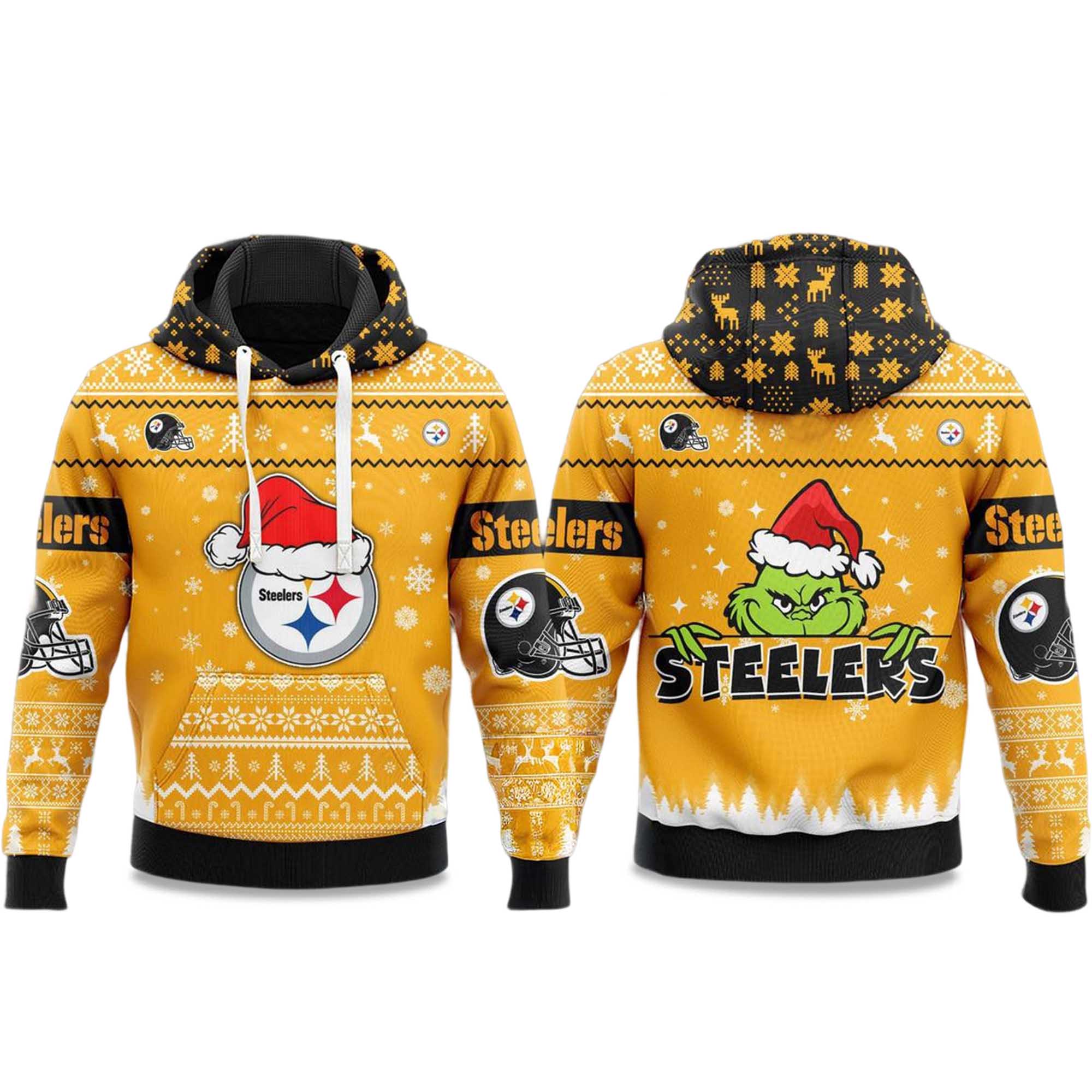The front features the Steelers logo in a festive circle, surrounded by snowflakes and holiday motifs. The back features a grinning Grnch wearing a Santa hat, combined with the word “Steelers” for a fun and eye-catching look. The hoodie has a cozy inner lining, an adjustable drawstring hood, and ribbed cuffs for added warmth, effortlessly combining comfort and festive style.