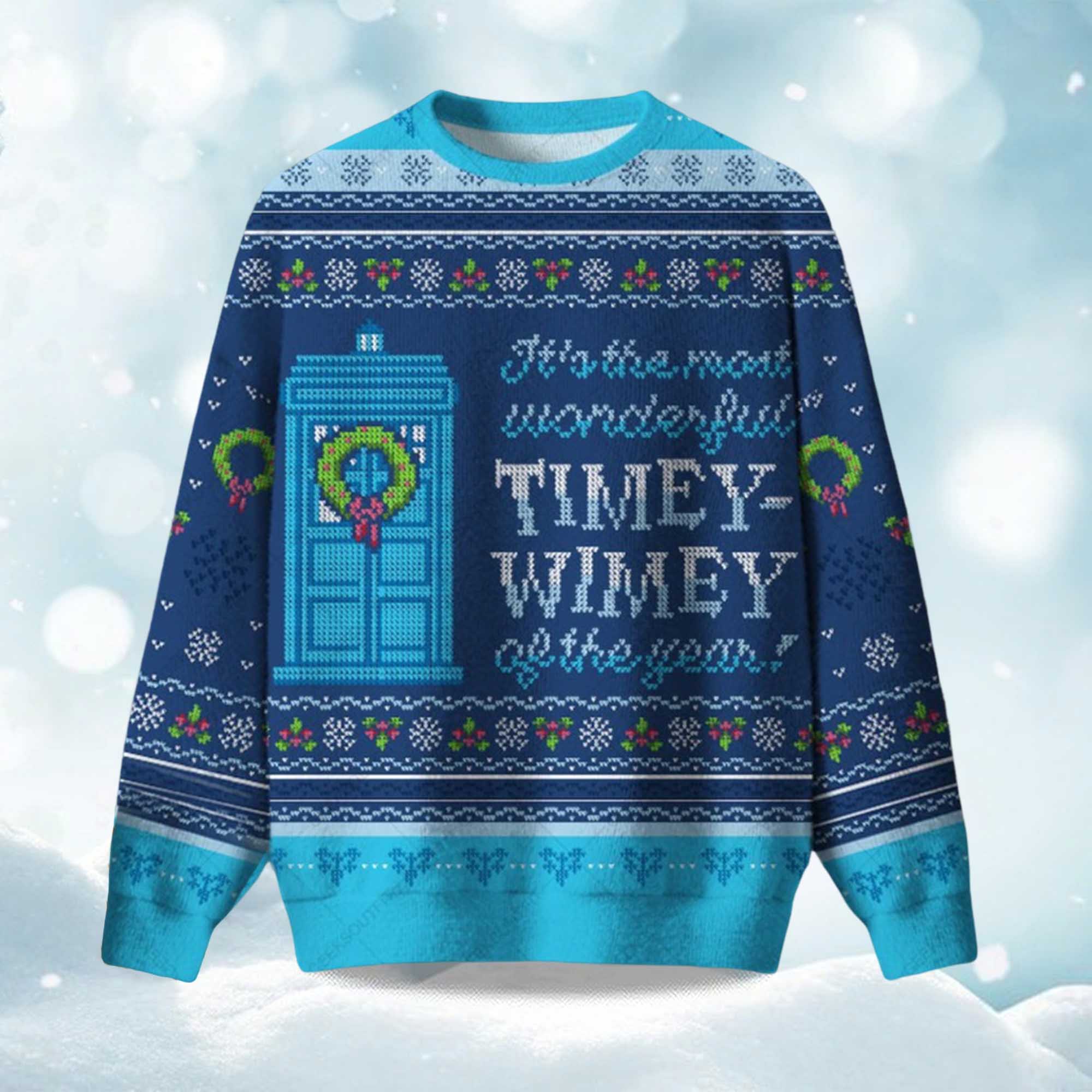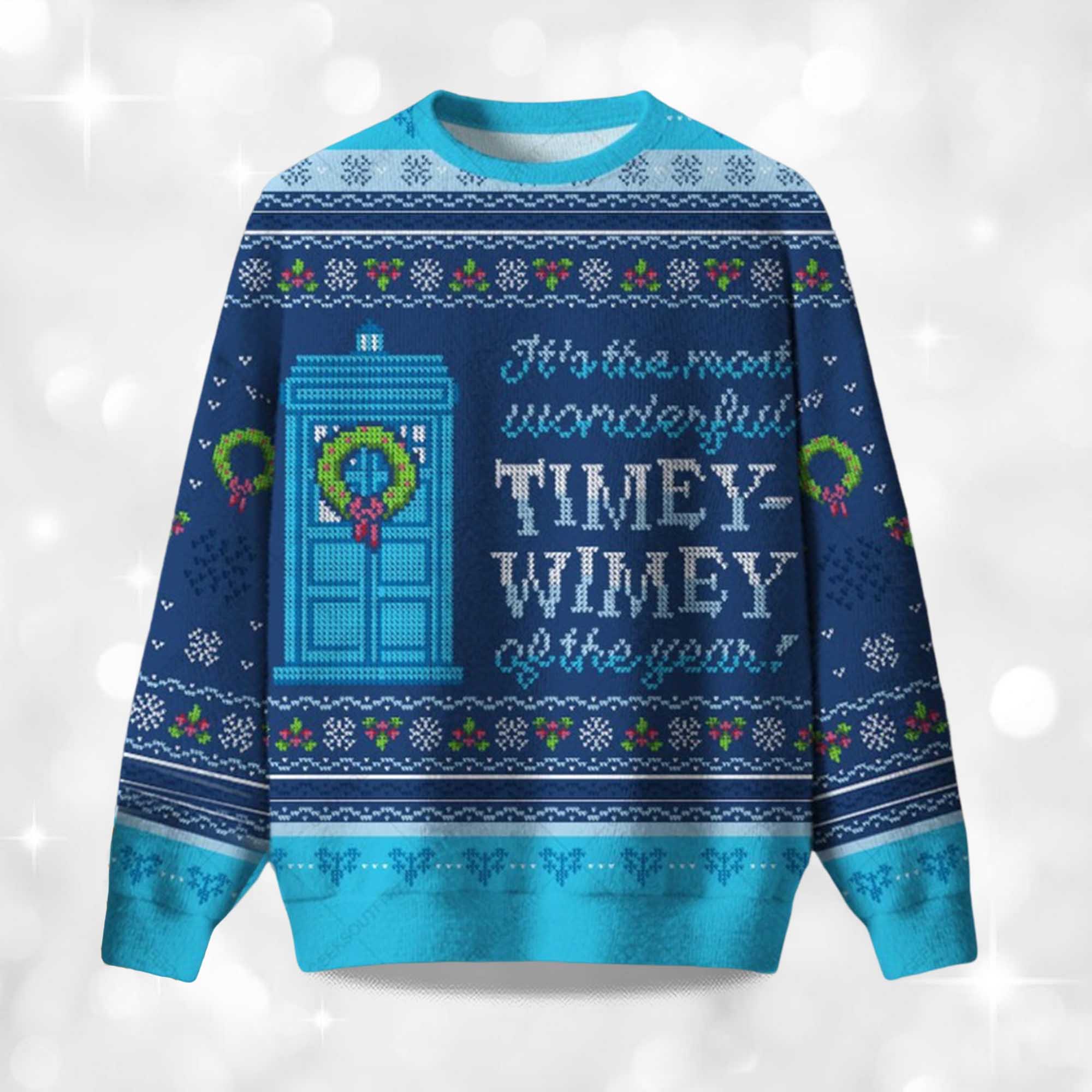 The 2025 Timey Wimey Ugly Christmas Sweater puts a charming twist on holiday fashion with its vibrant blue color palette and whimsical time-themed artwork. Featuring a pixelated blue time-travel booth decorated with wreaths, and the text “It’s the most wonderful time of the year”, this sweater combines the festive spirit with creative sci-fi humor, creating a standout for the season.