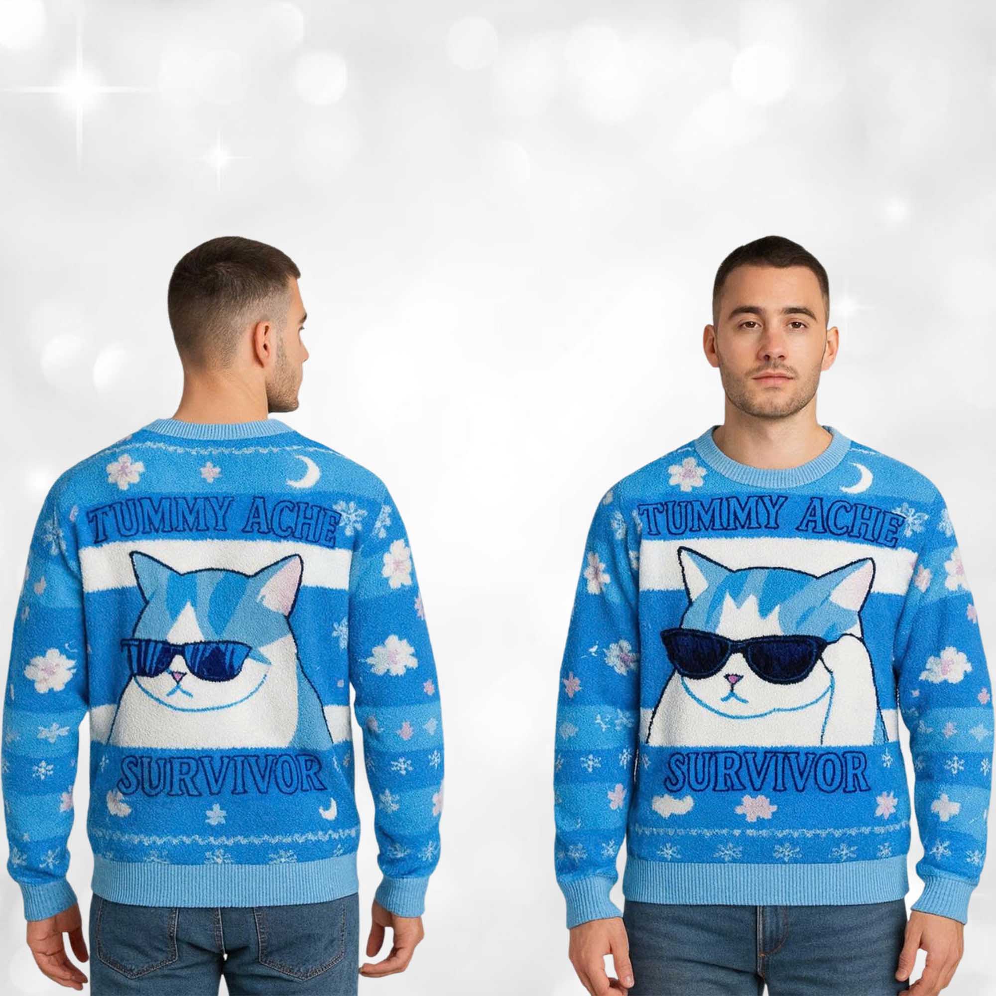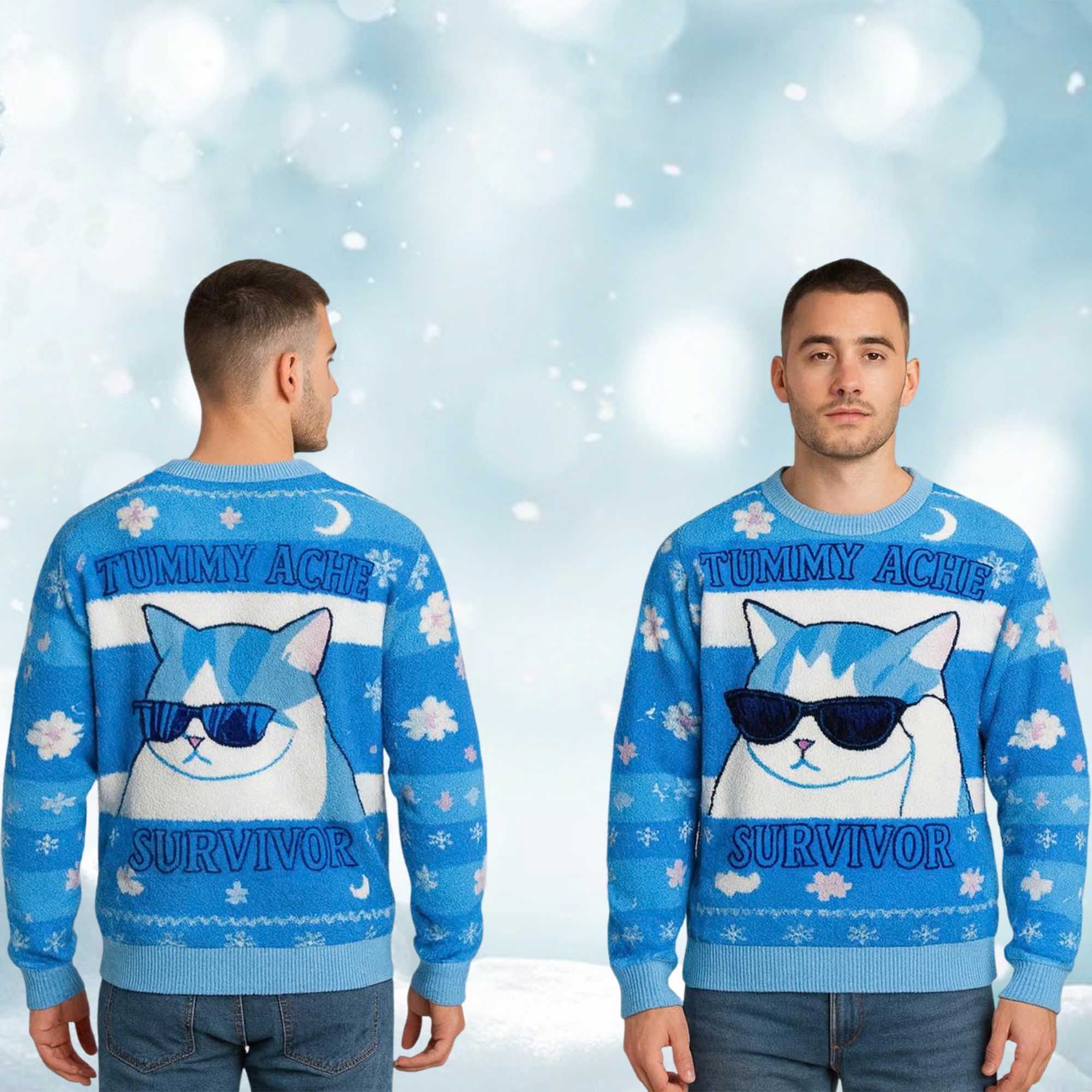 2025 Tummy Ache Survivor Christmas Ugly Sweater is slowly making its way back into holiday wardrobes, especially for those who love a laid-back and playful style. With its deep blue hue, adorable cat wearing sunglasses, and playful text, the sweater easily stands out at gatherings. It brings a bit of comfort and playfulness to an already warm and cheerful holiday season.