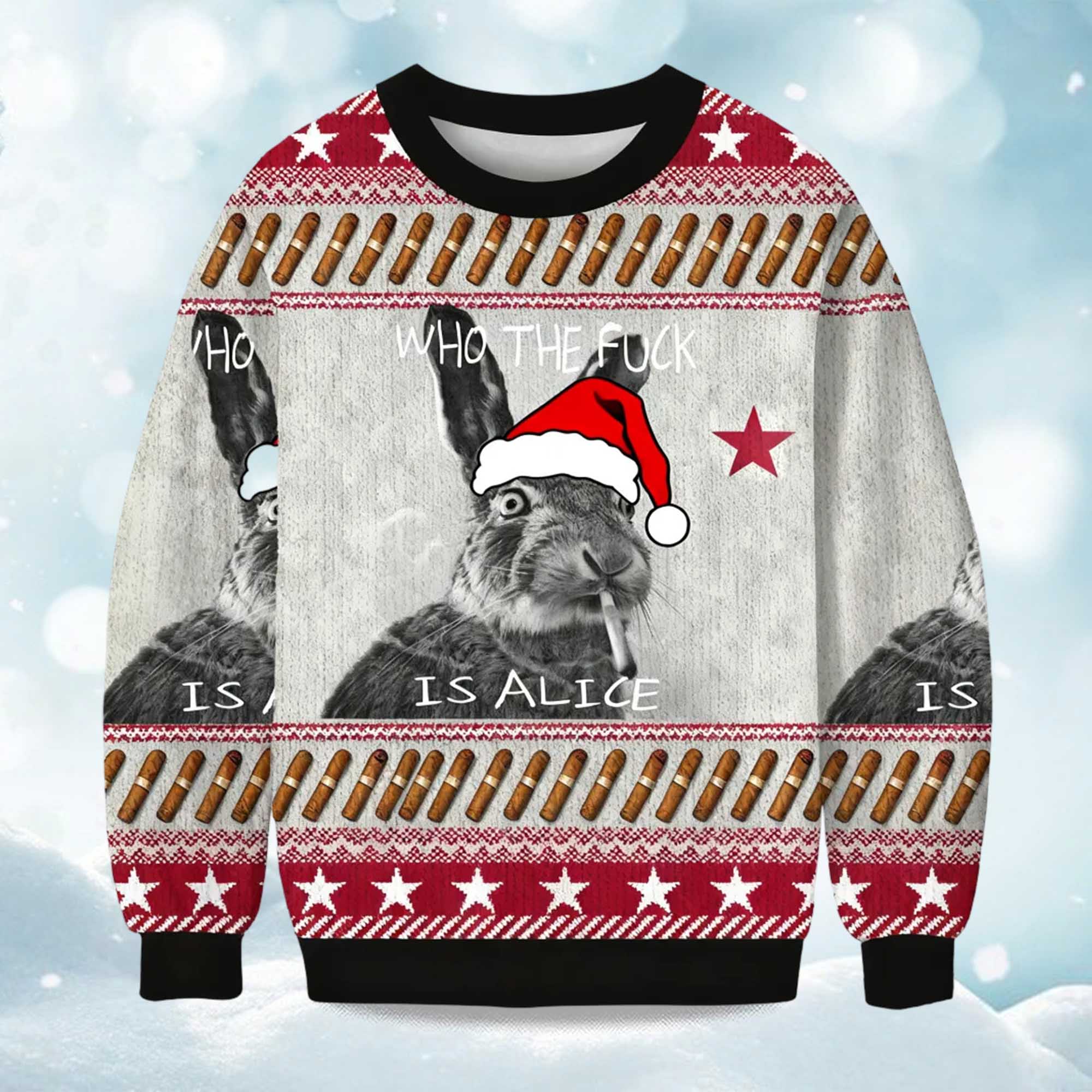 Alice Smoking Rabbit Christmas Ugly Sweater 2025 – Wild Humor for Winter 2025