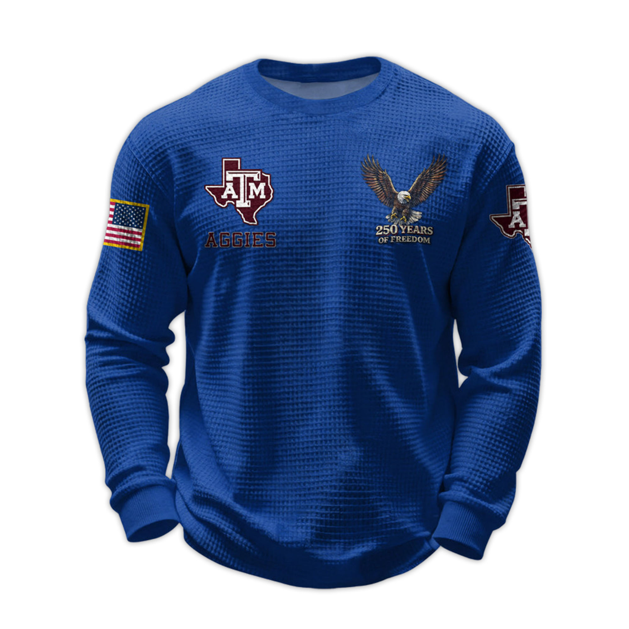 The 2026 Aggies 250 Years Of Freedom Waffle Sweatshirt is rapidly becoming a popular choice among Texas A&M University supporters. Inspired by the 250th anniversary of freedom, this design combines the strong Aggies identity with a modern, sophisticated look. This is the ideal choice for fans who want a simple, meaningful, and easy to wear item for everyday life.