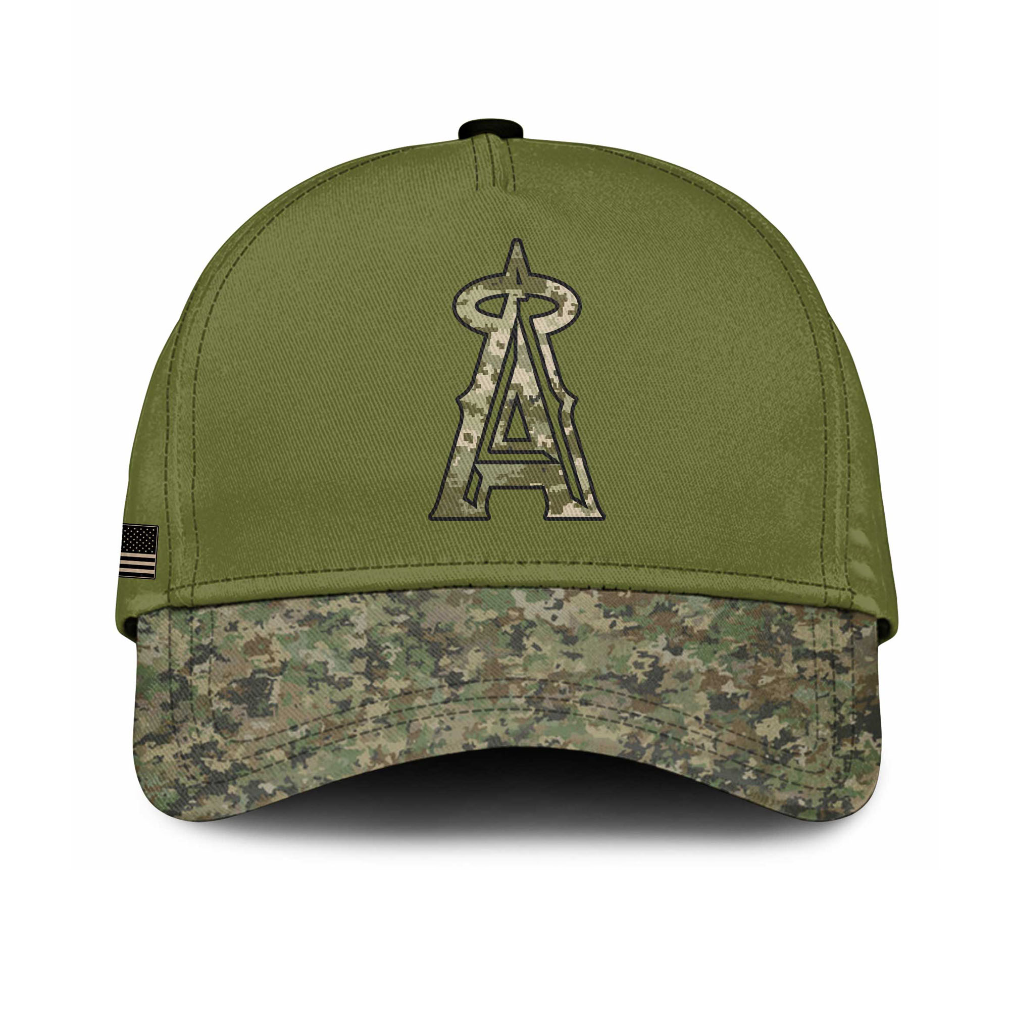 The design draws inspiration from military uniforms and national symbols. Olive tones reflect strength and resilience, while the camouflage pattern symbolizes unity and readiness. Star and stripe elements connect to a broader sense of pride, combining these themes with the Angels’ team identity to create a product that is both respectful and visually powerful.