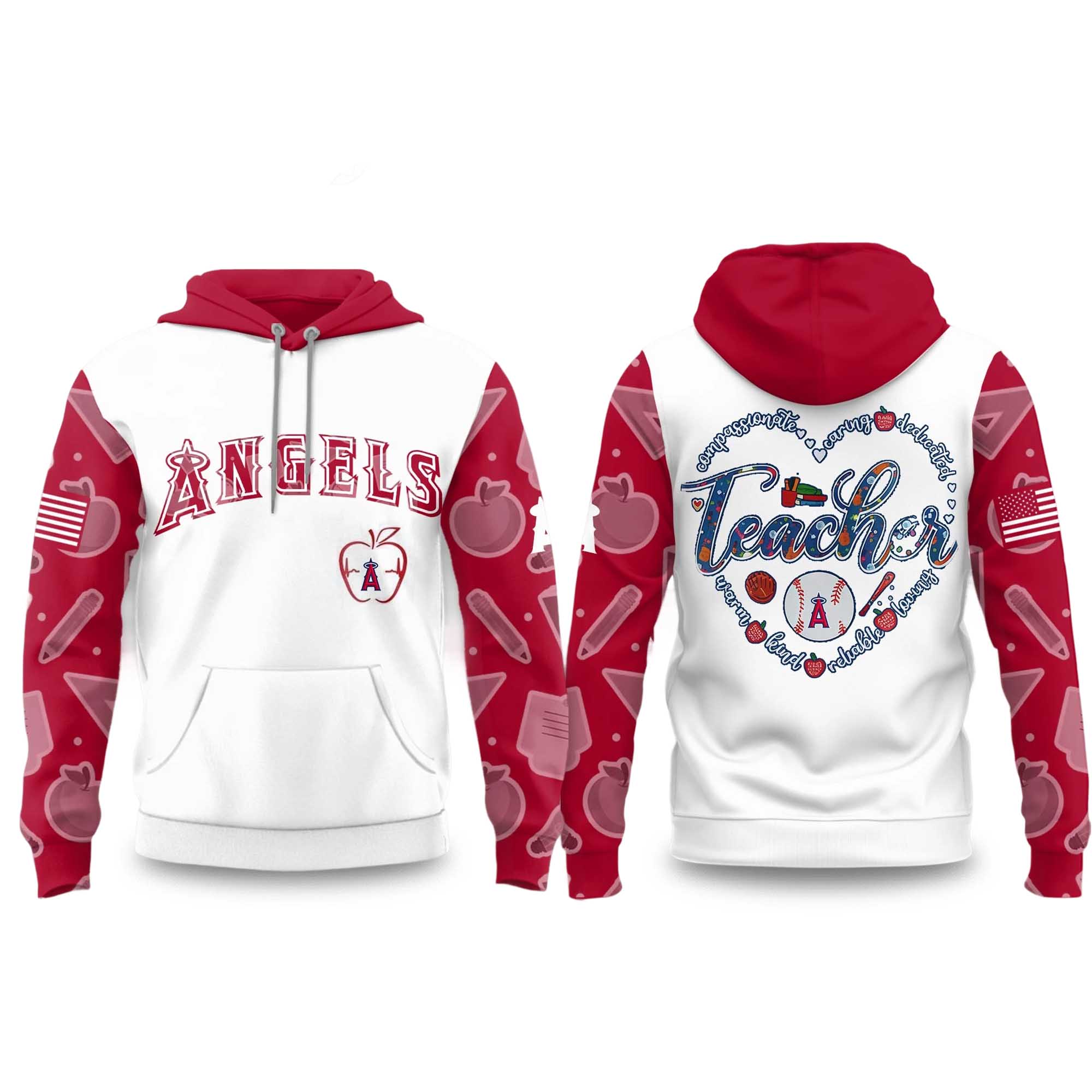 The 2026 Angels Teacher Appreciation Night Hoodie continues the tradition of honoring educators with a design that is both vibrant and heartfelt. Inspired by special baseball night events, this hoodie combines baseball culture with a message of gratitude. The pristine white body is paired with striking red sleeves featuring a school-themed graphic, while the back displays a heart design with the word Teach symbolizing the dedication of teachers. This is a personalized product, perfect for fans who want to support both their team and their community.