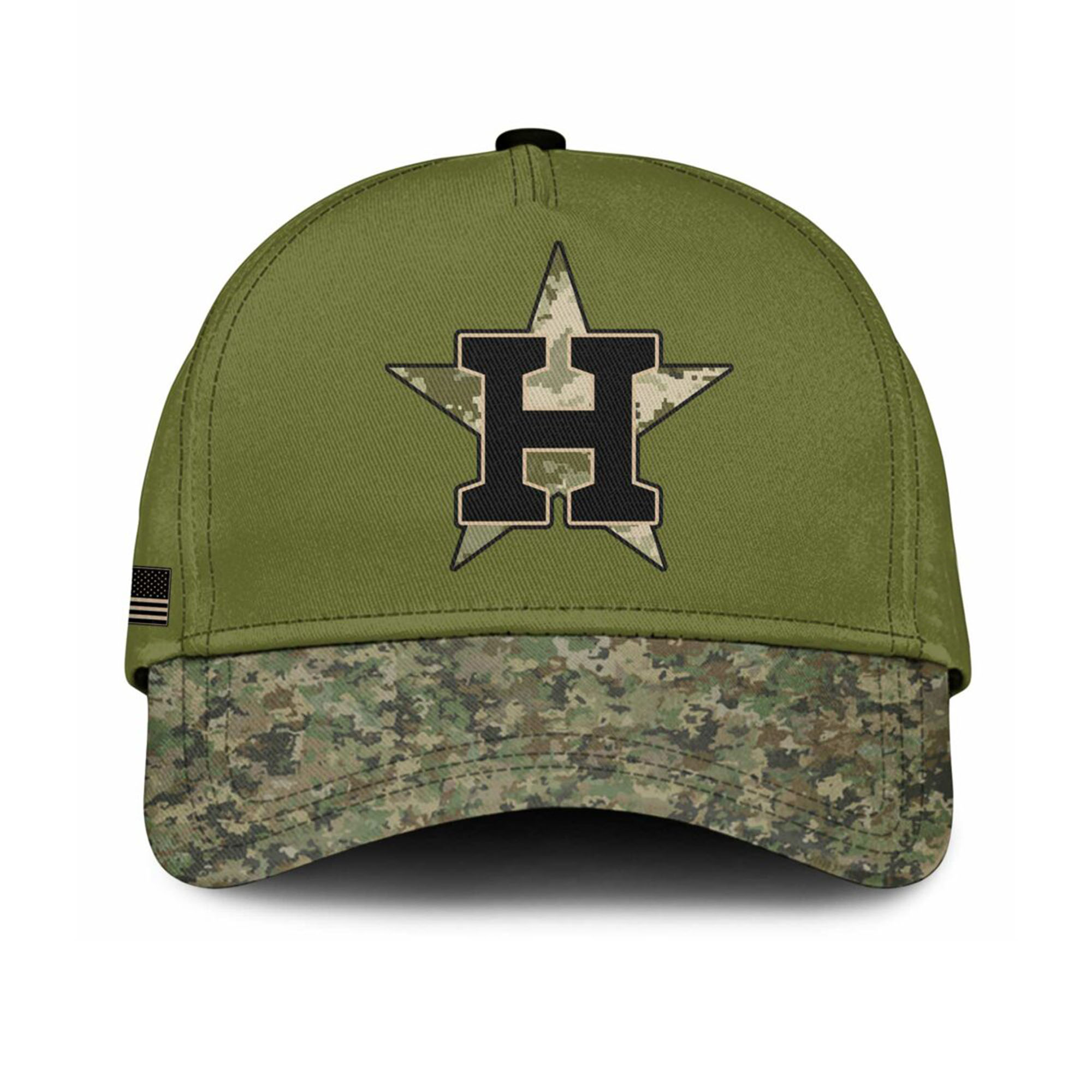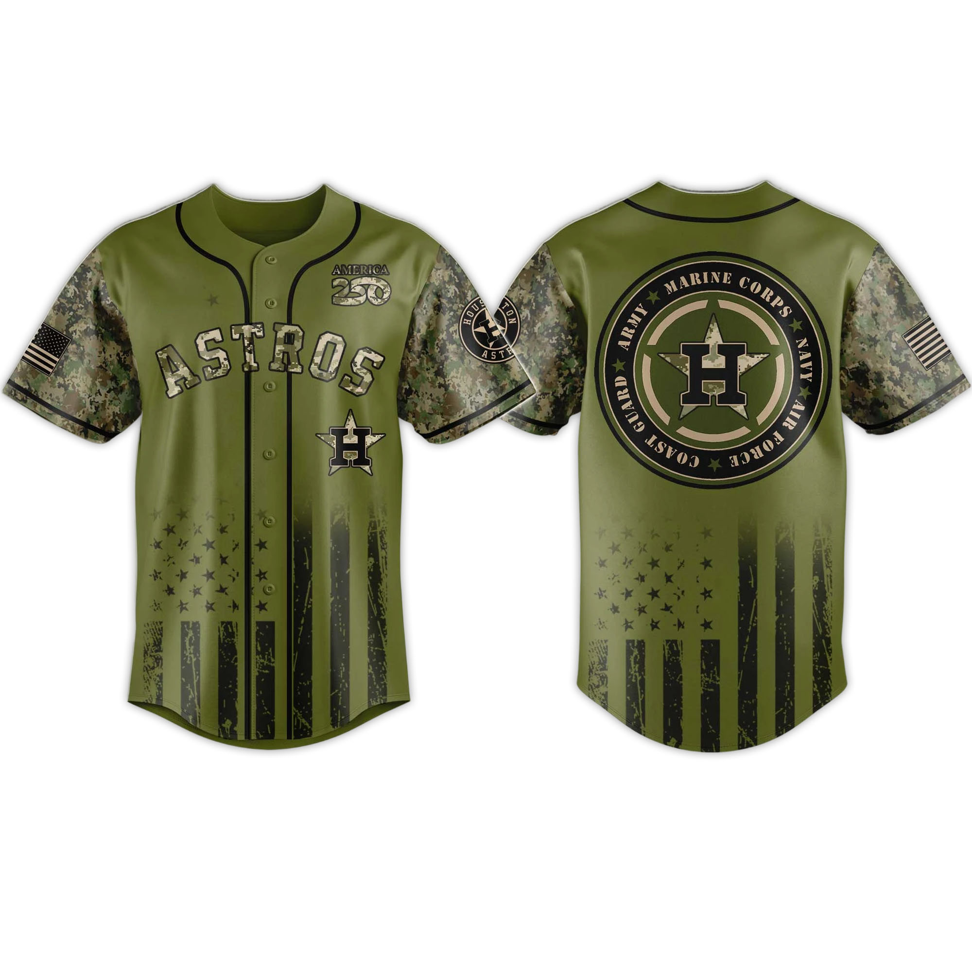 What sets this jersey apart is the combination of camouflage and the Astros’ colors. The lettering on the front is bold and sharp, while the patches on the sleeves add deeper meaning to the design. The fabric is lightweight yet durable enough for frequent wear. Every detail, from the color choices to the layout, creates a jersey that is both sporty and respectful.