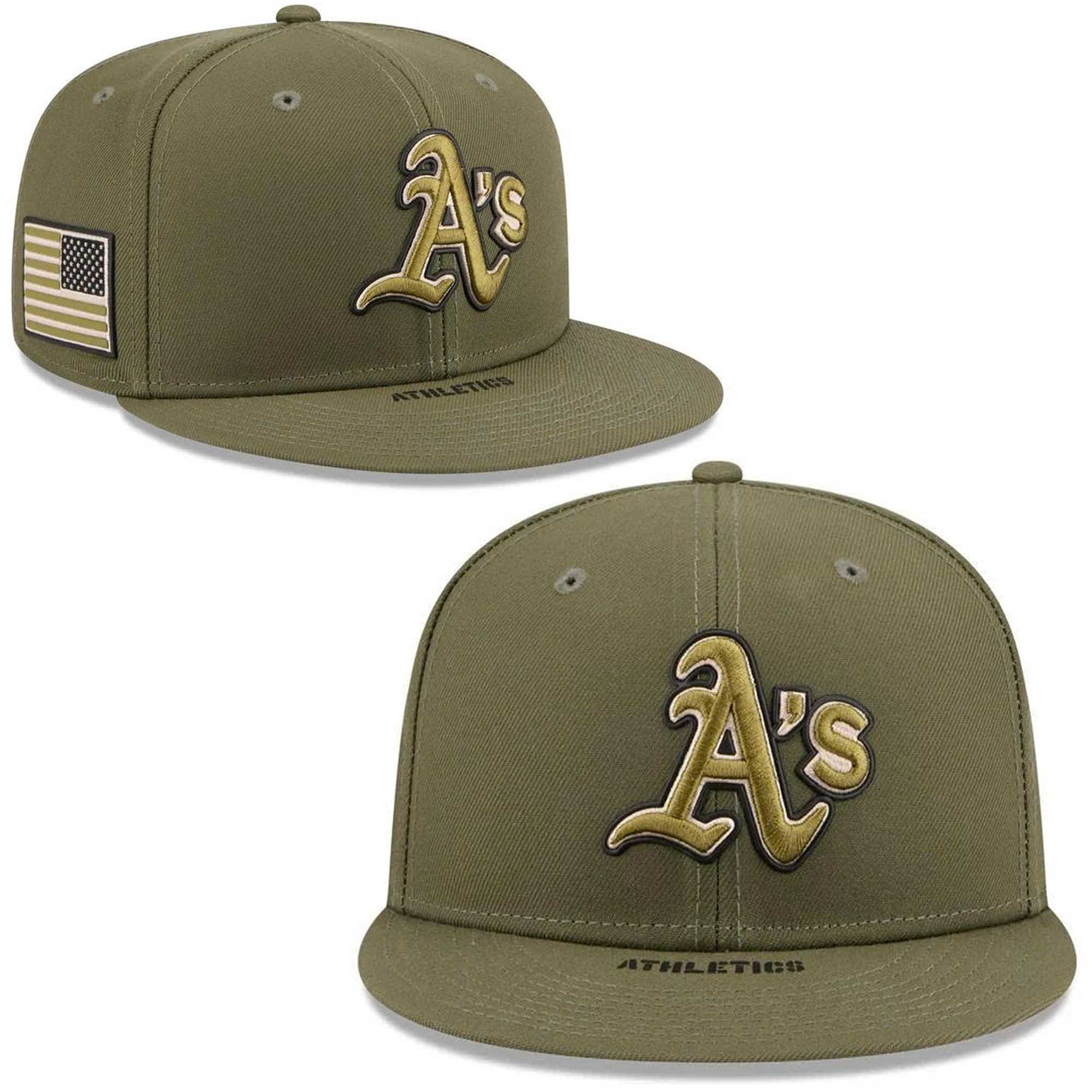 The highlight is the army olive green background color, giving the cap a clear identity for Armed Forces Day. On the front, the classic A’s logo is embroidered with gold and black outlining for a strong contrast. A matching American flag patch sits on the side, adding a patriotic detail without overshadowing the design. The retail description for this edition also notes the team name elements and premium logo details.