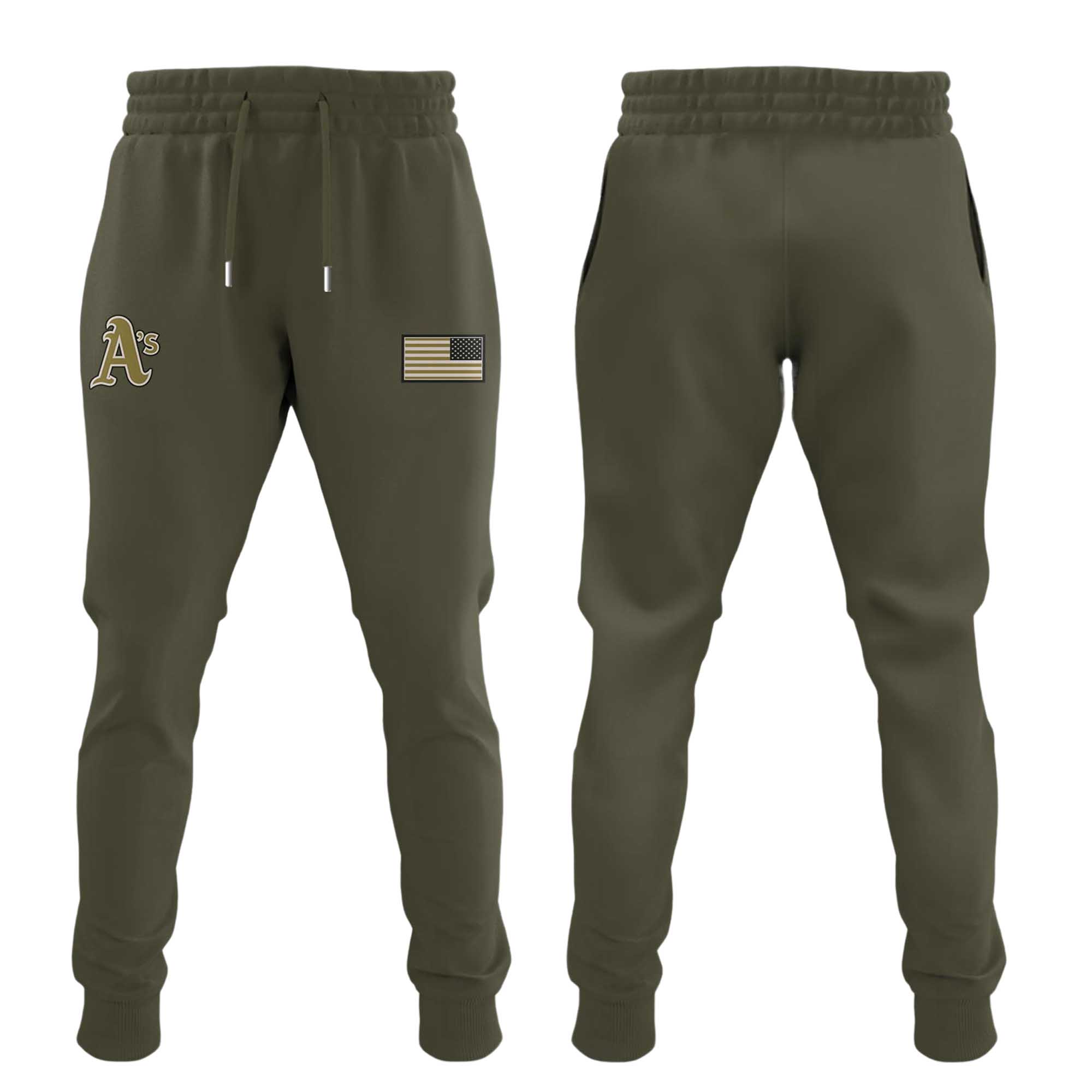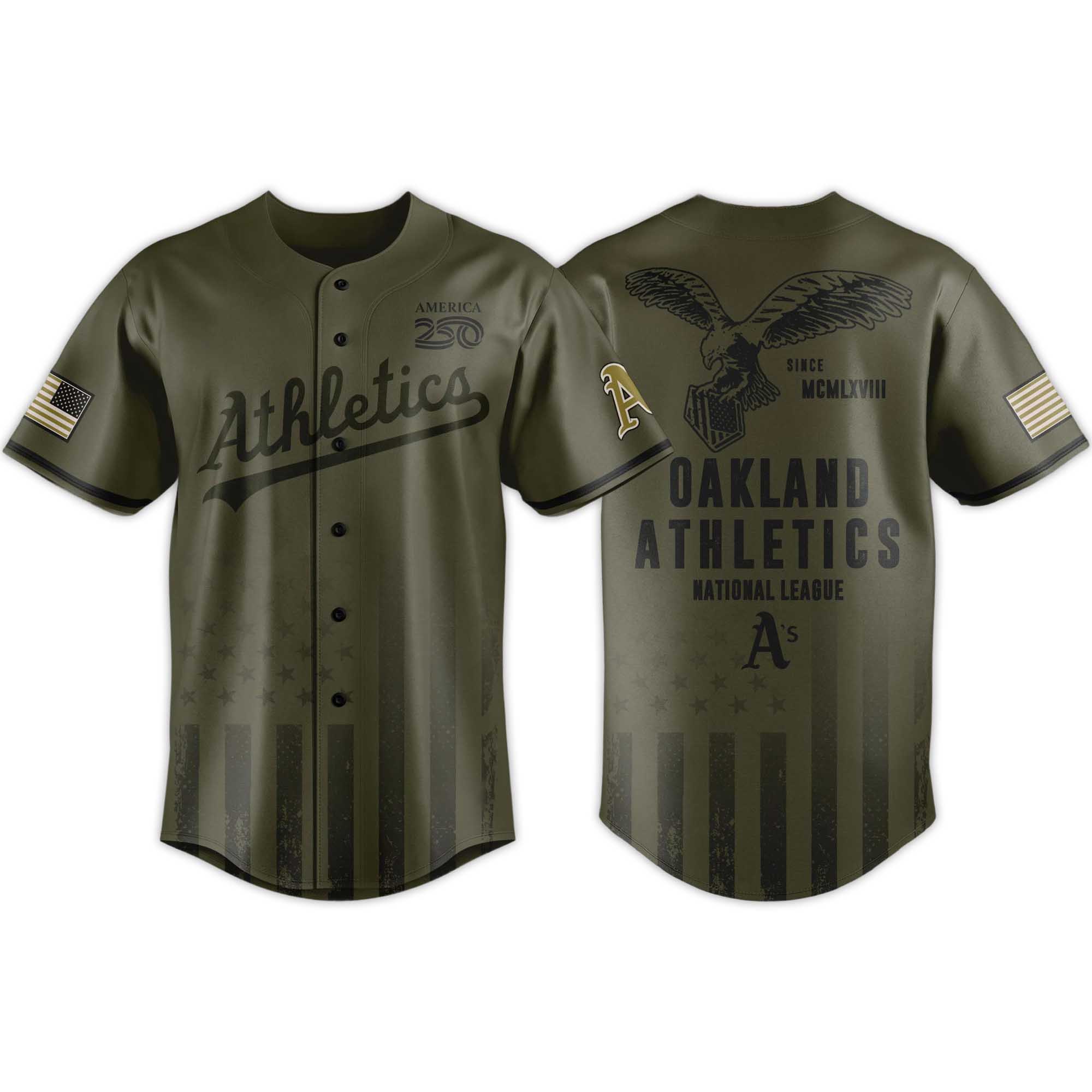 This jersey features an olive green military-inspired background, paired with dark trim and bold Athletics lettering on the chest. On the back, a prominent eagle image sits atop the large Oakland Athletics lettering, creating a powerful look. The flag detail on the sleeve adds a patriotic touch, while the subtle stripes at the bottom add depth to the shirt. The classic baseball silhouette completes the look with a clean style.