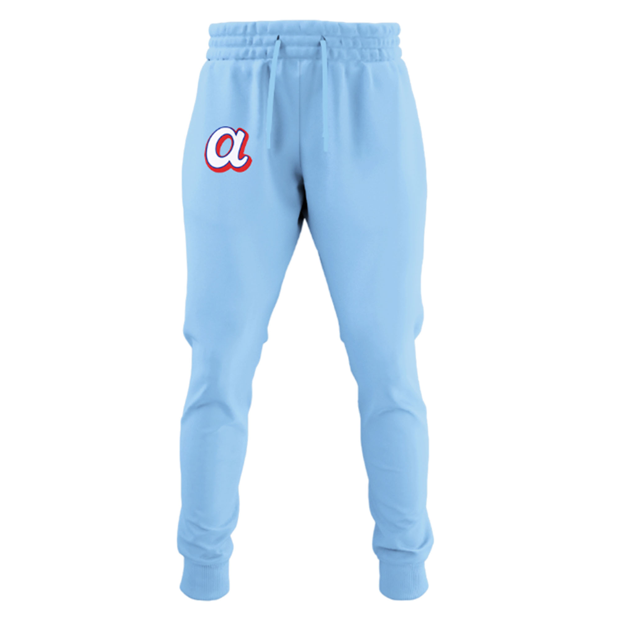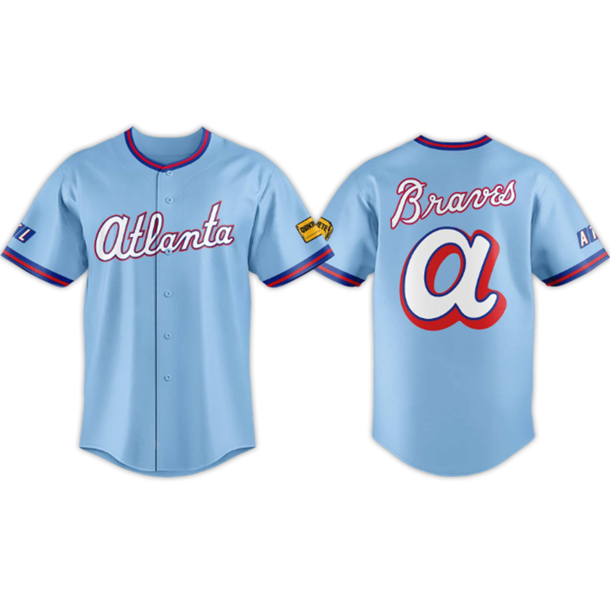 This jersey features a striking light blue background, accented with red and dark navy trim on the collar and sleeves. The Atlanta lettering on the front has a timeless appeal, while the oversized A on the back creates a bold statement. High-quality stitching and durable materials ensure long-lasting durability, making it a reliable item for many years to come.