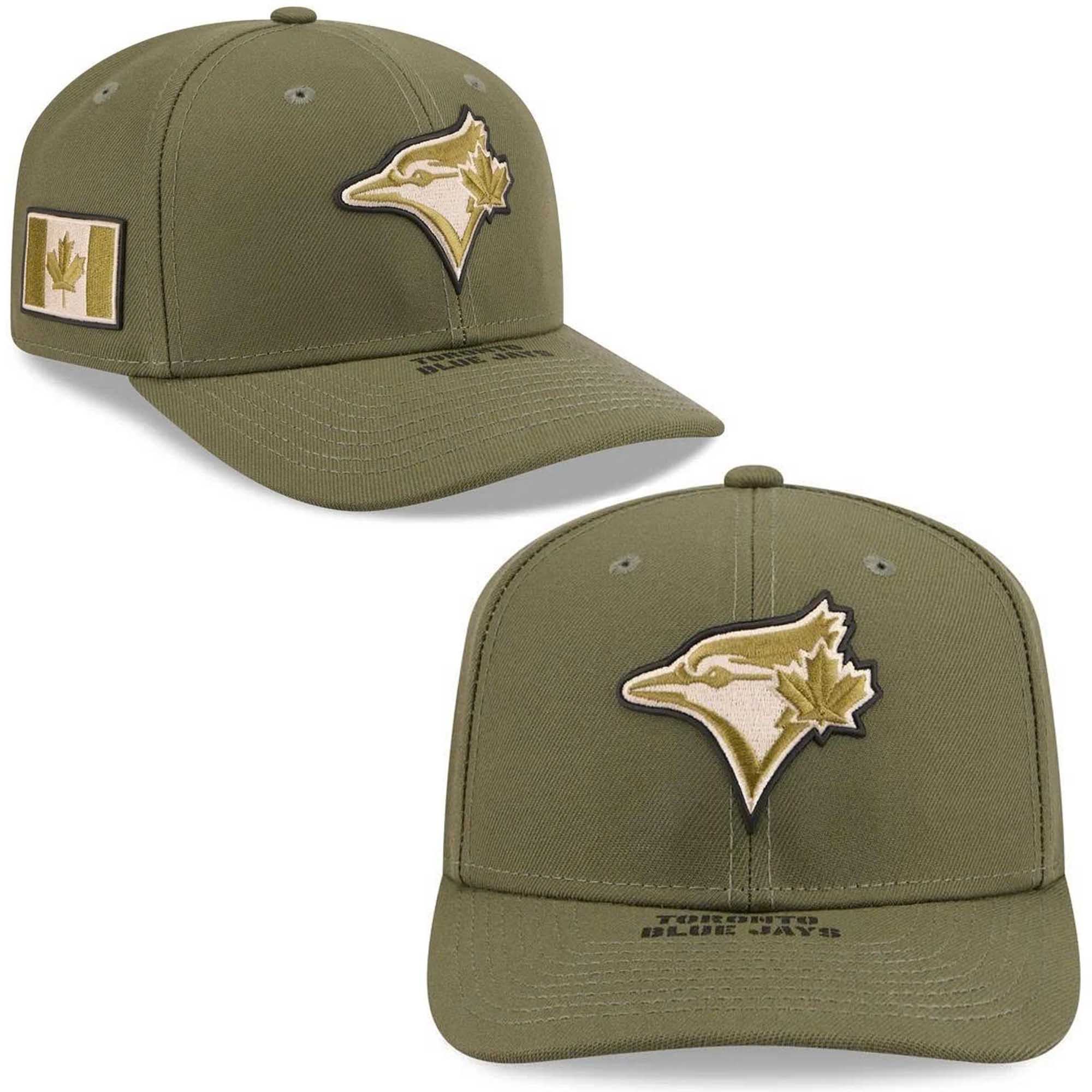 This cap uses an olive green base color inspired by military uniforms, creating a strong and versatile look. The front features the Blue Jays bird logo with an embroidered maple leaf accent, finished with gold, black, and bright trim for added depth. The side patch with maple leaf detail inspired by the Canadian flag adds a touch of national pride while maintaining the theme of honor. The curved brim keeps the style timeless, and the neutral color palette easily matches jerseys, hoodies, jeans, and casual wear.