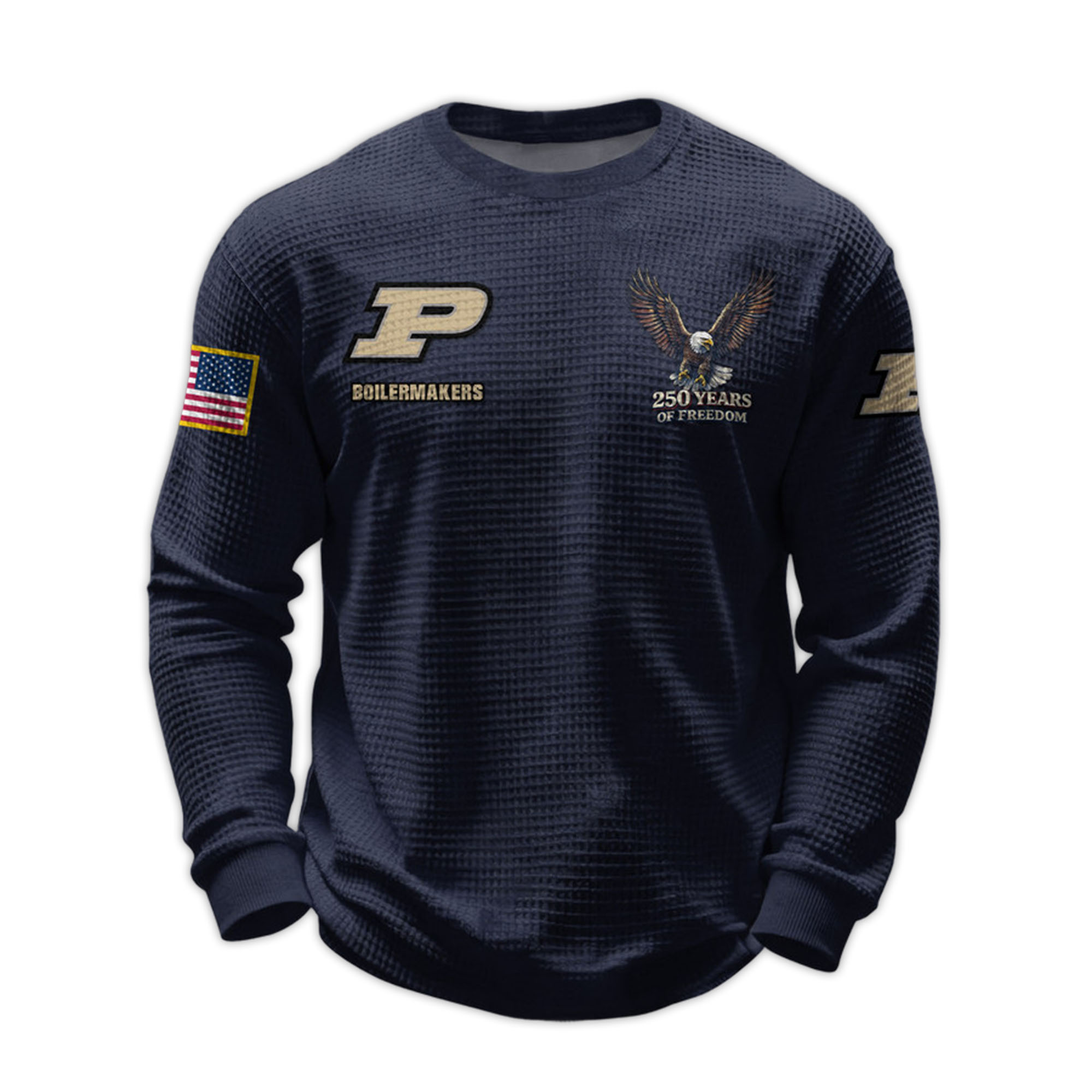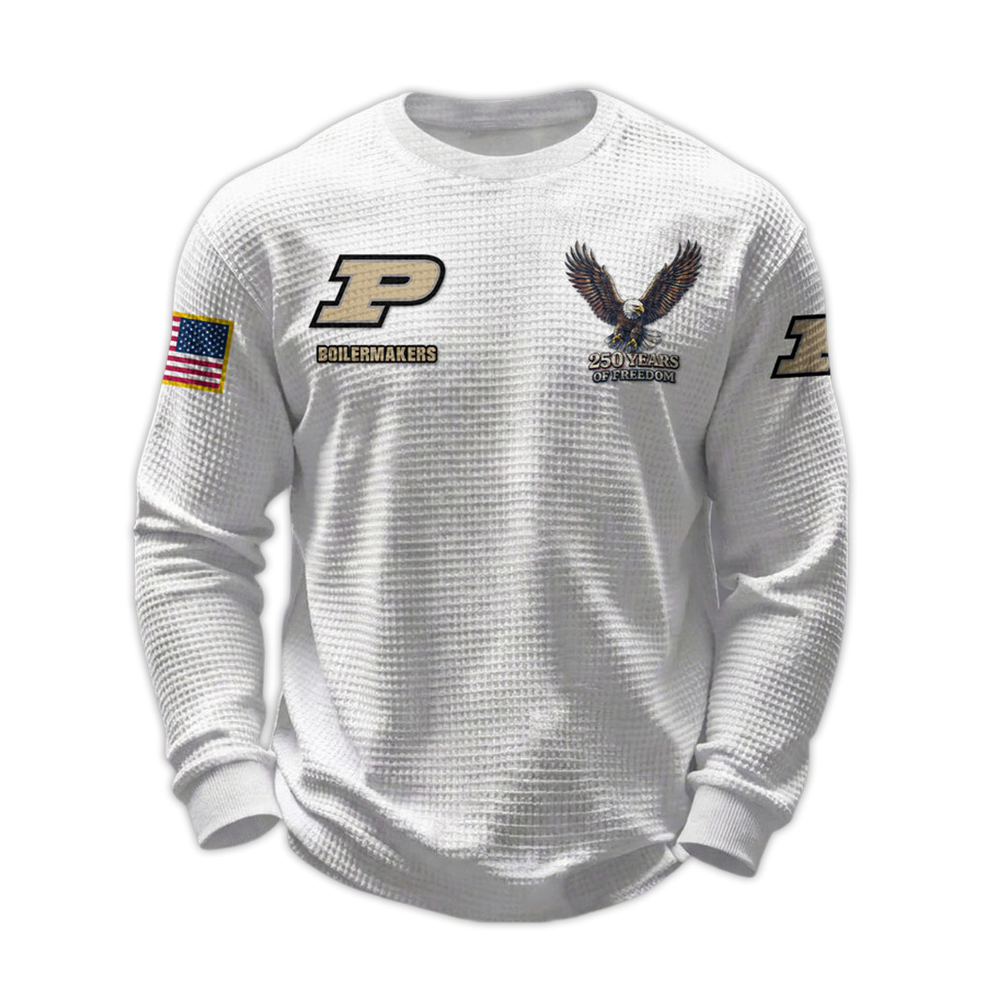 The 2026 Boilermakers 250 Years Of Freedom Waffle Sweatshirt reflects both Purdue pride and a historic American milestone. With its sleek athletic silhouette and meaningful details, this sweatshirt is a great choice for fans who want comfort and striking design in one product.
