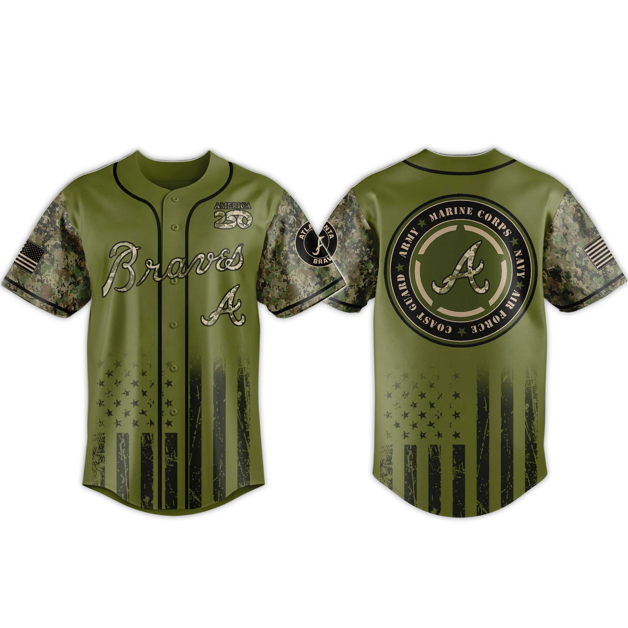 The 2026 Braves Military Appreciation Night Jersey delivers a powerful new look with an olive green base and camouflage sleeves. This year’s version looks stronger and more detailed, especially with the flag-inspired stripes at the bottom. The circular logo on the back adds a modern touch while retaining the classic Braves identity that fans love.