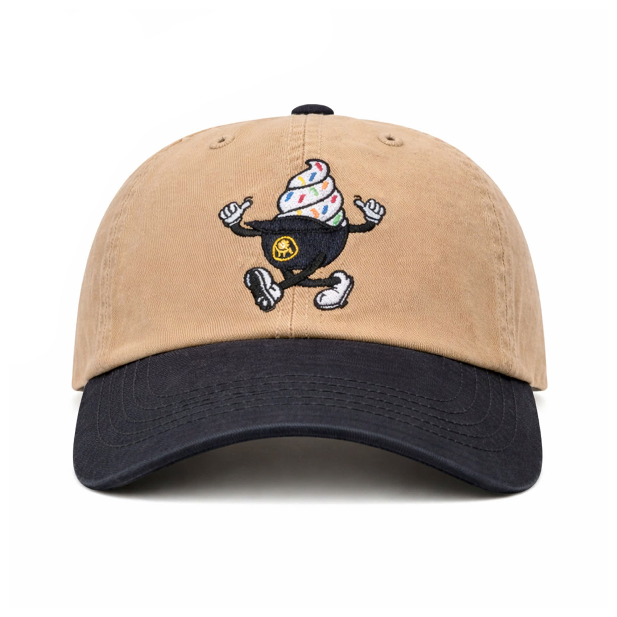 This hat features a light brown crown paired with a dark curved brim, creating a harmonious and balanced color combination. At the center, a playful ice cream mascot is embroidered, designed with movement and personality. This character incorporates subtle details inspired by the Brewers team, making it both fun and connected to the team’s identity. Overall, it looks fresh, modern, and easy to wear.
