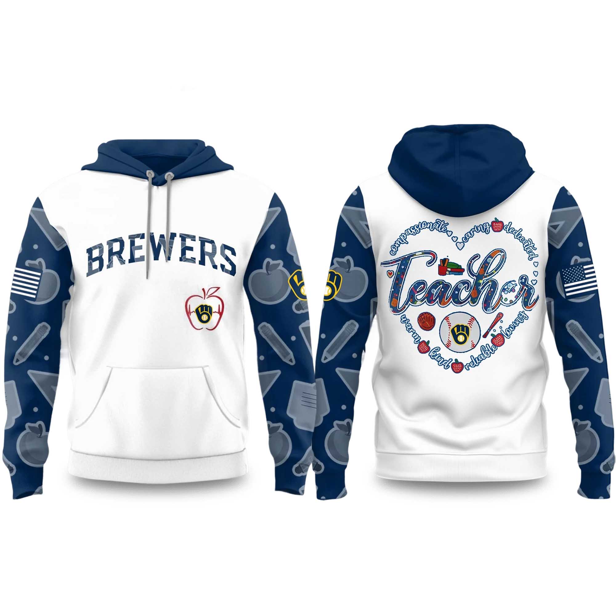The front features bold Brewers lettering on a pristine white background, creating a classic sporty look. The sleeves are accented with a dark blue background decorated with classroom-themed icons such as apples, pencils, and school supplies. On the back, a heart surrounds the phrase Best Teacher Ever, combined with elements inspired by the Brewers team. The combination of white and navy tones creates a balanced and modern look, making the hoodie easy to style while still attracting attention.