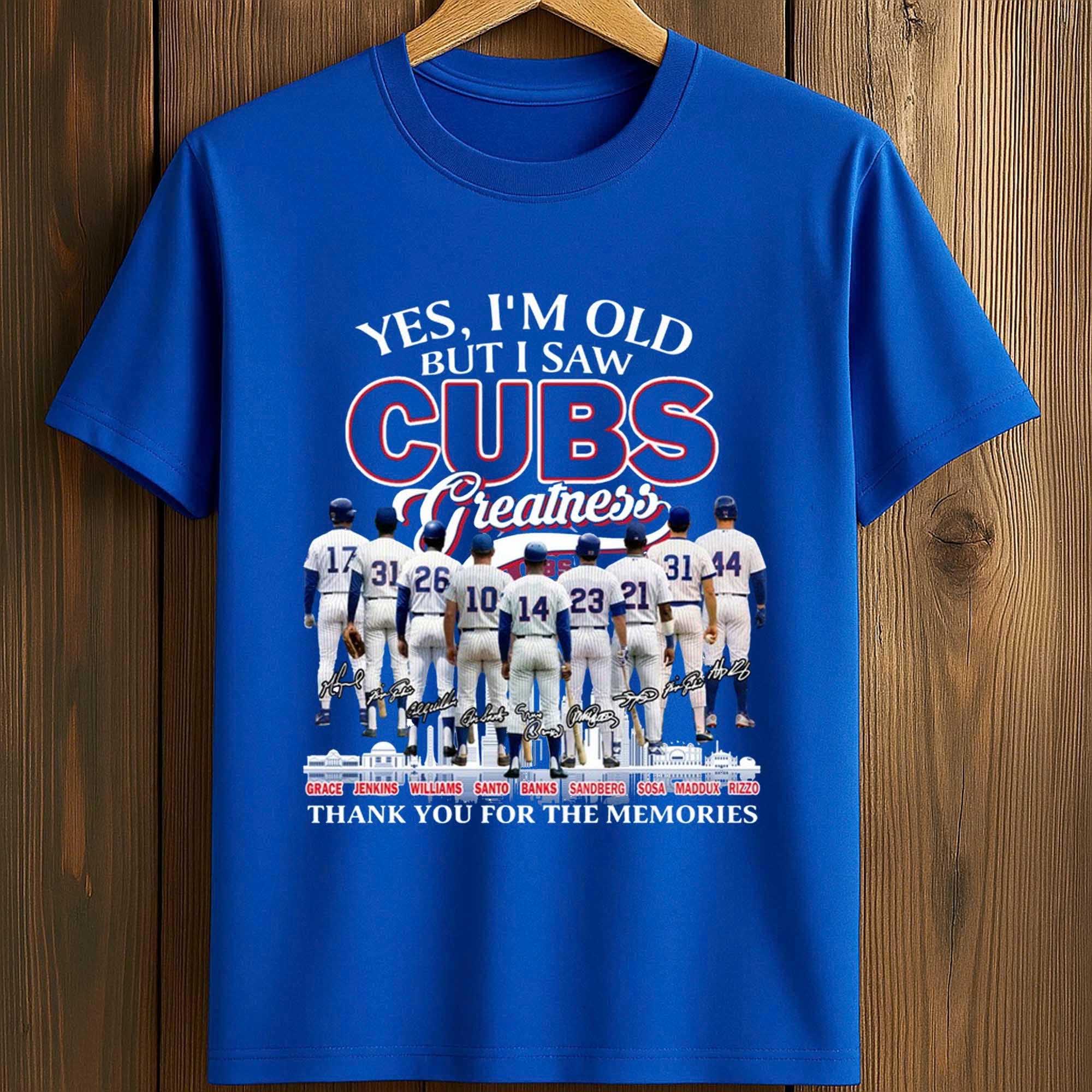 This shirt features a dark blue background that highlights the bold white and red lettering Yes, I’m Old But I Saw Cubs Greatness. The design depicts images of the players from behind, each representing memorable moments in the team’s history. The detailed illustration and balanced layout create a powerful visual impact, while the message Thank you for the memories adds an emotional touch.