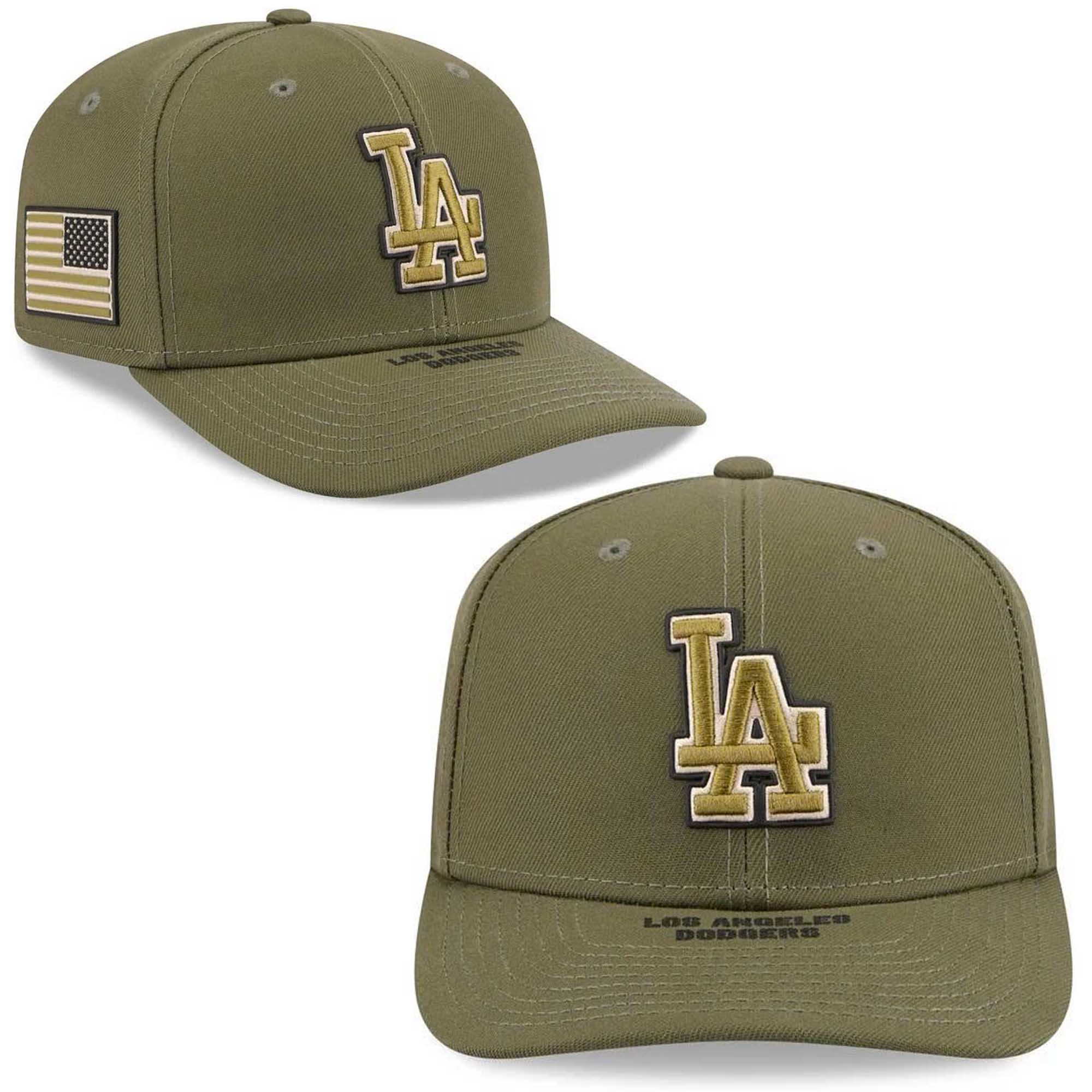 The olive green color gives the hat a strong, military-inspired look, standing out from the traditional Dodgers green. On the front, the LA logo is embossed with layers of light brown, cream, and dark trim for added depth. The matching American flag patch on the side adds meaning without making the design cluttered. The curved brim provides comfort. Clean lines and balanced spacing make the cap look sharp from every angle.