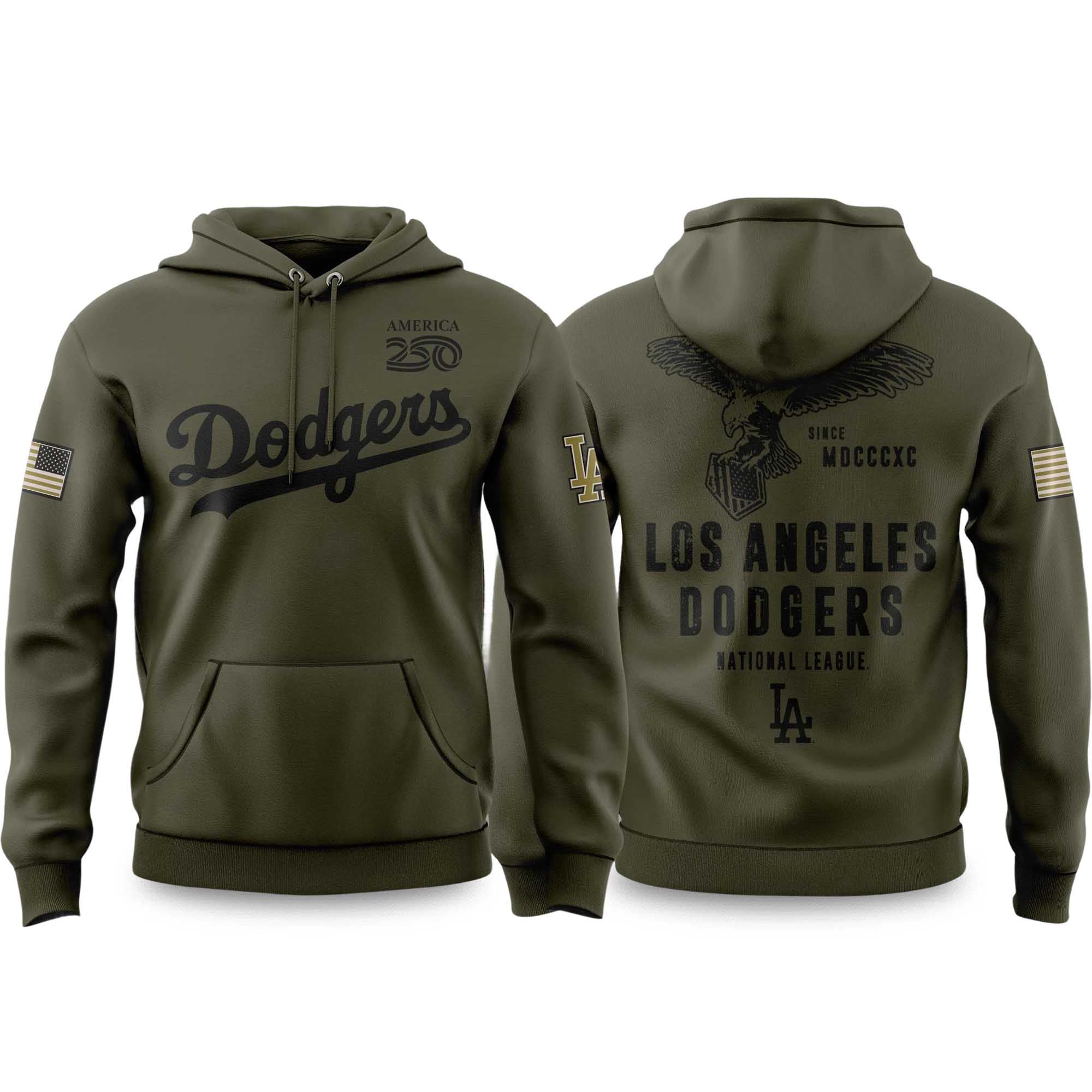 The olive green color gives this hoodie a military-inspired look, perfectly suited to the Armed Forces Day theme. On the chest, the Dodgers iconic lettering logo stands out with a clean and confident style. A small America 250 image adds a patriotic touch, linked to the 2026 anniversary year. On the back, a powerful eagle sits atop the overlapping Los Angeles Dodgers lettering, creating a bold design symbolizing the team’s strength, freedom, and pride. A flag detail on the sleeve completes the look and balances the overall design.